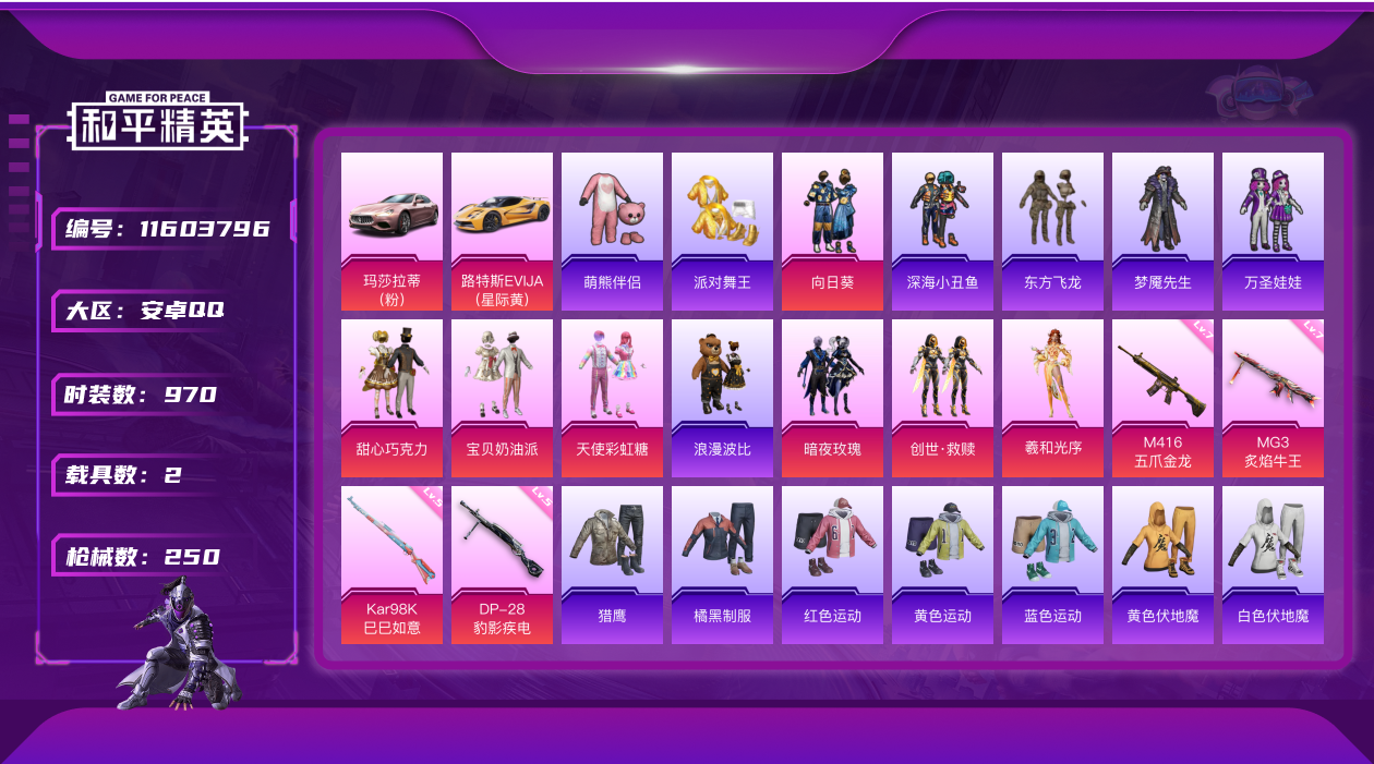 [11603796]6粉装 4特效枪 2载具 15印记 可二次 可修改实名 身法装备:舞王派对(派对舞王、小金鞋),暗影哥特(红眼罩),萌熊伴侣背包(粉熊背包) 优质装备:玛莎拉蒂Ghibli(粉),甜心巧克力,路特斯EVIJA(星际黄),舞王派对(派对舞王、小金鞋),萌熊伴侣背包(粉熊背包),M416五爪金龙,宝贝奶油派,天使彩虹糖,向日葵(套装-向日葵先生),MG3炙焰牛王,七级MG3-炙焰牛王,七级M416-五爪金龙,羲和光序,Kar98K-巳巳如意 热门装扮:暗夜玫瑰,创世·救赎,万圣娃娃,梦魇先生,深海小丑鱼,东方飞龙,浪漫波比,萌熊伴侣,派对舞王(小金鞋) 稀有枪皮:DP-28-豹影疾电 五级特效枪:五级Kar98K-巳巳如意,五级DP-28-豹影疾电 紫色装扮:SS22特训,SS23特训,SS21特训,SS31特训套装,SS2特训,SS3特训,SS4特训,SS5特训,人气偶像,六六大吉,冰川特警,决胜时刻,冷焰舞者,凛冬战士,刚毅裁决者,北国孤狼,午夜朋克,旭日情侣,SS30特训套装,云朵鹅,彩虹兔,雪绒豹,SS33特训套装,青涩时光,顶瓜瓜,5.56爱好者,SS20特训,SS15特训,SS16特训,冰爽海盐,银白舞王,SS13特训,治愈之星,科技之星,SS14特训,飞驰魅影,音速流光,SS19特训,竞技角斗士,浑天鲲鹏,覆海蛟龙,甜心亚梦,虚音幻奏,瑞龙福将,团圆交子,SS17特训,异彩先驱,SS18特训,向日葵先生,阳光火鸡,都市魅力,酒红色名流,酷潮明星,野性战心,野性战魂,金鼠迎春,长空猛禽,雪山征服者,雪山精英,雷霆特警,霓虹极客,霓虹街区,青春校园,迎春赐吉,风暴特警,缤纷果语,荣耀,蓝彩潮人,蓝色运动,虎虎生威吉莉,超能勇士,飞行日记,骑行爱好者,魅力单车,鹤鸣,黄色伏地魔,黄色名流,黄色格斗者,黄色运动,黎明保卫者,黑色伏地魔,龙的传人,龟仙人,冰河战士,龙魂突击队,蝶变,和平特警,沙漠毒蛇,极地朋克,极速红龙,柠萌假日,格斗先锋,棕色飞行服,橘黑制服,沙漠兵团,派对绅士,海岛探路者,海滨突袭者,深蓝色名流,滨海假日,幻影武者,圣诞大吉,坚韧舞者,夏日倾情,夏日音浪,夜莺强袭者,完美偶像,帅气教官,幻世战舞者,怒火燎原,战地名士,战地督导,战地菁英,湖蓝色名流,滨海厨神,绮丽涂鸦,甜蜜菠萝,生化防暴队,疯狂小兔子,登山爱好者,白色伏地魔,破晓战魂,破蛋