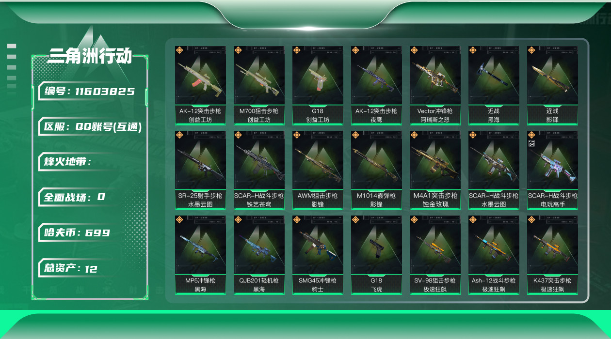 [11603825]可二次 可修改实名 实名:可修改 总资产:12.5 哈夫币:699.803 传说武器皮肤:近战-影锋,近战-黑海,SCAR-H战斗步枪-电玩高手,SCAR-H战斗步枪-水墨云图,SR-25射手步枪-水墨云图,AWM狙击步枪-影锋,M1014霰弹枪-影锋,SCAR-H战斗步枪-铁艺苍穹,G18-创益工坊,Ash-12战斗步枪-极速狂飙,SV-98狙击步枪-极速狂飙,AK-12突击步枪-夜鹰,SMG45冲锋枪-骑士,AK-12突击步枪-创益工坊,M700狙击步枪-创益工坊,QJB201轻机枪-黑海,MP5冲锋枪-黑海,K437突击步枪-极速狂飙,MP7冲锋枪-深空威胁,G18-飞虎,M4A1突击步枪-蚀金玫瑰,Vector冲锋枪-阿瑞斯之怒 史诗武器皮肤:SR-25射手步枪-尖端治疗,AS Val突击步枪-尖端治疗,SG552突击步枪-尖端治疗,Ash-12战斗步枪-守夜人,MP5冲锋枪-深海恐惧,SG552突击步枪-深海恐惧,M16A4突击步枪-竞赛选手,M1014霰弹枪-林中猎手,PTR-32突击步枪-英雄,M7战斗步枪-禁卫 干员外观:红狼-蚀金玫瑰,骇爪-水墨云图,威龙-飞虎