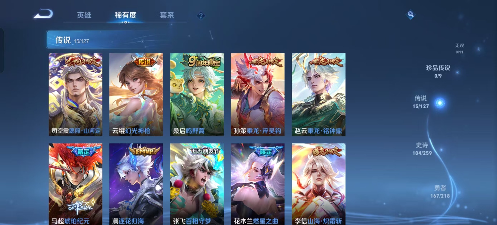 赵云乘龙·铭钟鼎,张飞百相守梦,孙策乘龙·淬吴钩,曜云鹰飞将,马超琥珀纪元,马超无双飞将,澜逐花归海,云缨幻光神枪
