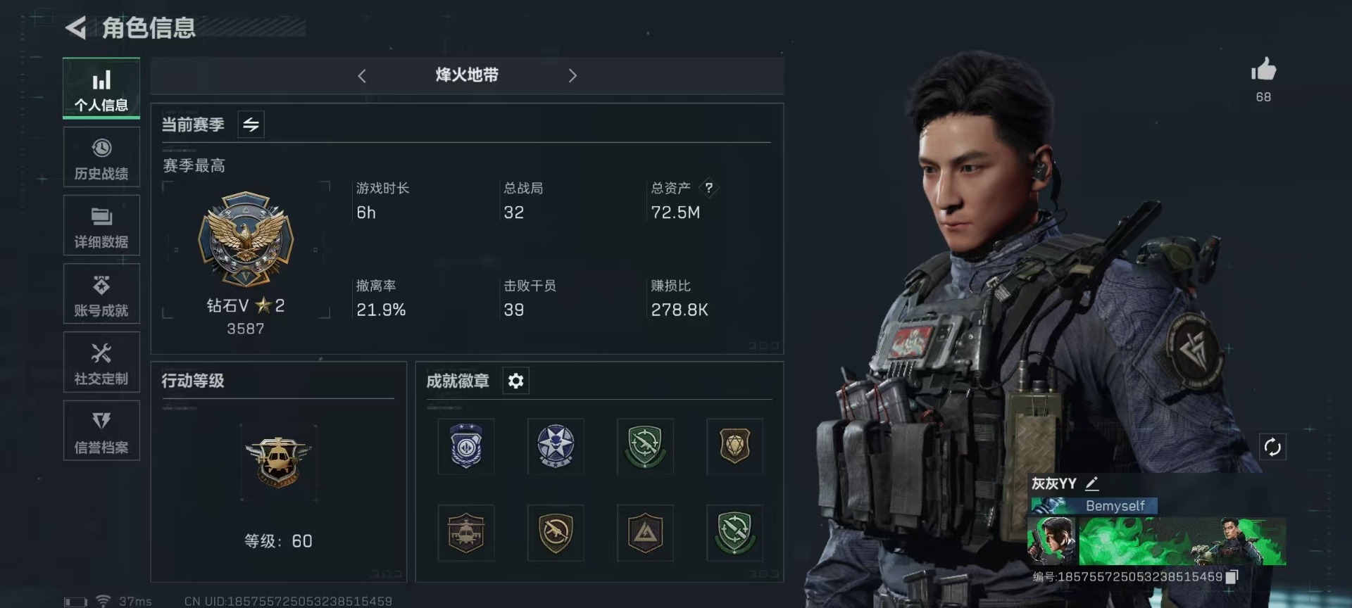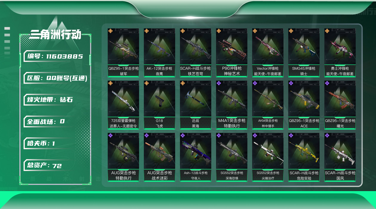 [11603885]总资产:72.5M 1干员外观 1近战传说 10传说枪械 哈夫币:1.348K 高级安全箱(2×3)9.15号到期 可二次 可修改实名 优质装备:近战-黑海 烽火地带段位:钻石 全面战场段位:上等兵 传说武器皮肤:SCAR-H战斗步枪-铁艺苍穹,SMG45冲锋枪-骑士,G18-飞虎,勇士冲锋枪-能天使-午夜邮差,Vector冲锋枪-能天使-午夜邮差,725双管霰弹枪-送葬人-无题密令,AK-12突击步枪-夜鹰,P90冲锋枪-神秘艺术,QBZ95-1突击步枪-破军 史诗武器皮肤:SR-3M紧凑突击步枪-英雄,QBZ95-1突击步枪-ACE,AUG突击步枪-特勤执行,M4A1突击步枪-特勤执行,Vector冲锋枪-红色彗星,PTR-32战斗步枪-ACE,SKS射手步枪-ACE,M700狙击步枪-蝮蛇,G3战斗步枪-战场英杰,Ash-12战斗步枪-守夜人,PKM通用机枪-守夜人,AS Val突击步枪-尖端治疗,M700狙击步枪-守夜人,SG552突击步枪-尖端治疗,SR-25射手步枪-尖端治疗,M1014霰弹枪-林中猎手,MP5冲锋枪-深海恐惧,勇士冲锋枪-深海恐惧,SG552突击步枪-深海恐惧,AKM突击步枪-林中猎手,.357左轮-幸运时刻,AS Val突击步枪-典狱官,SV-98狙击步枪-囚徒,PSG-1射手步枪-无垢,M700狙击步枪-阿萨拉工艺,M14射手步枪-黑鹰坠落,QBZ95-1突击步枪-曙光,UZI冲锋枪-危险实验,M249轻机枪-维京,SCAR-H战斗步枪-危险实验,沙漠之鹰-曙光,SCAR-H战斗步枪-国风,G3战斗步枪-阿萨拉工艺,SVD狙击步枪-阿萨拉工艺,S12K霰弹枪-曙光,AS Val突击步枪-刀锋,PKM通用机枪-英雄,PKM通用机枪-魔药,M700狙击步枪-竞技风,93R-博士,AUG突击步枪-战术迷彩 干员外观:威龙-飞虎