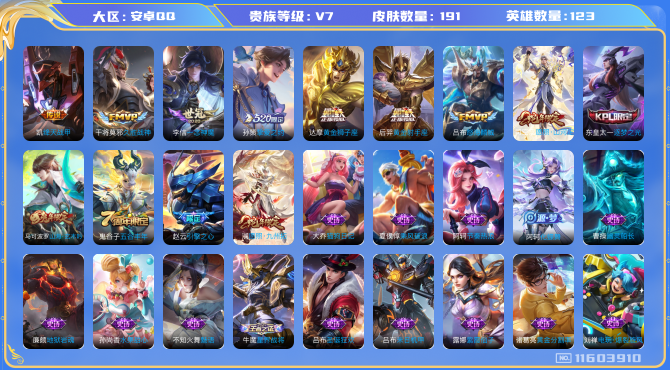 [11603910]V7 9传说 123英雄 191皮肤 可修改实名 优质装备:黄金狮子座,黄金射手座,绛天战甲(鸡嘴战神),久胜战神,一念神魔,挚爱之约 珍宝阁皮:玩趣恶龙 限定皮:愿照·九州拓(澜年限),愿照·山河定(司空震年限),怒海麟威,五谷丰年,逐梦之光,引擎之心,山海·玄木吟(马可年限) 史诗皮:苍鳞隐世,化蝶舞,星界战将,龙之律动,战舞者,紫霞仙子,白龙吟,黄金分割率,特工魅影,电玩·爆裂旋风,百解令(蒙犽),蒙恬荣光圣徽,偶像歌手,魅语,晚萤,末日机甲-吕布,猫狗日记-大乔,节奏热浪,修罗,摇滚巨星,水果甜心,绅士熊喵,星夜王子,心灵骇客,暗隐猎兽者,幽灵船长,鬼剑武藏,舞动绿茵,地狱岩魂,乘风破浪,逐浪之夏,水晶猎龙者,金属风暴,原初追逐者,圣诞狂欢,鹰眼统帅,魅力维加斯,赏金猎手,无心