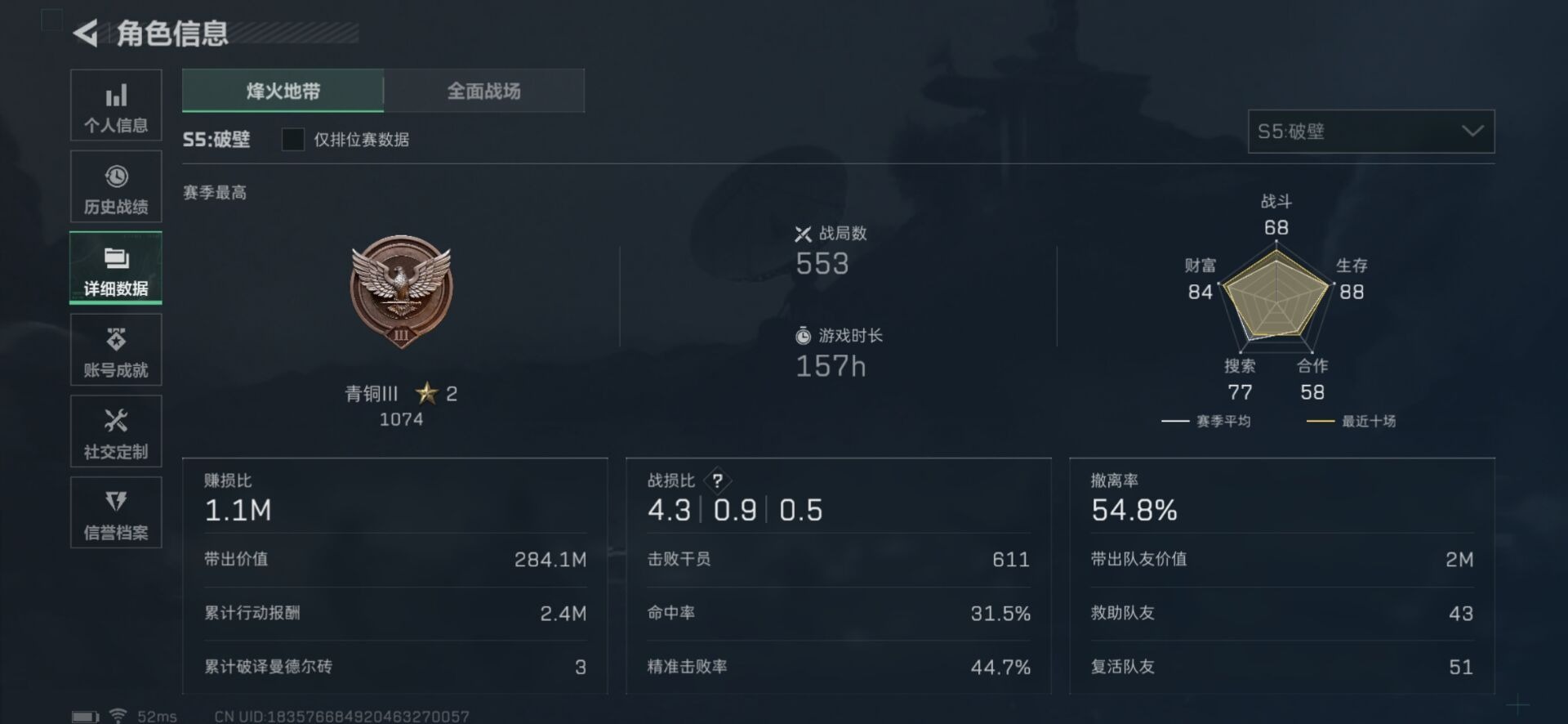[11603925]总资产:153.4M 7传说枪械 哈夫币:11.337K 进阶安全箱(2×2)9.15号到期 可二次 可修改实名 烽火地带段位:青铜 全面战场段位:无段位 传说武器皮肤:M4A1突击步枪-阿米娅,CAR-15突击步枪-阿米娅,复合弓-黑-天际线,AWM狙击步枪-捞点薯条,腾龙突击步枪-捞点薯条,93R-捞点薯条,勇士冲锋枪-能天使-午夜邮差 史诗武器皮肤:SV-98狙击步枪-林中猎手,SV-98狙击步枪-囚徒,QBZ95-1突击步枪-曙光,SVD狙击步枪-阿萨拉工艺