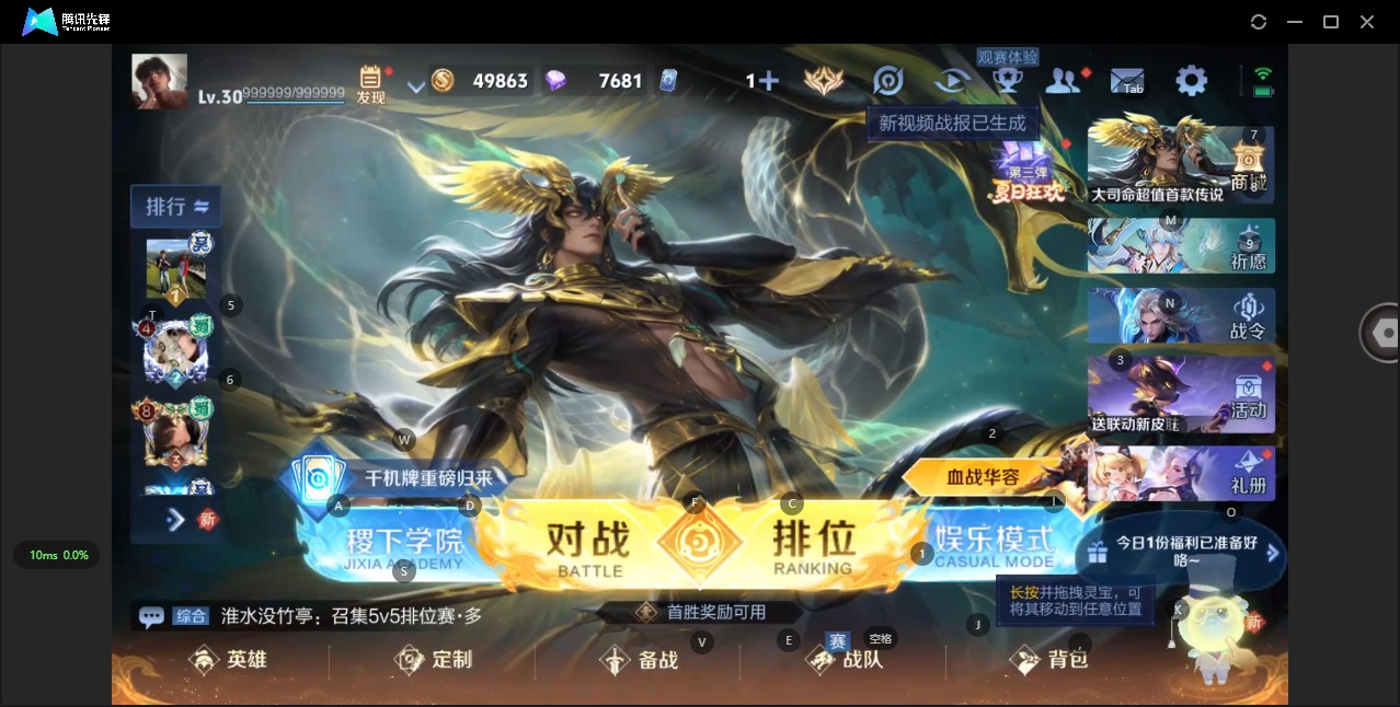 - [11868156]V7 3传说 101英雄 78皮肤 可修改实名 优质装备:地狱火,地狱之眼,超时空战士-狄仁杰 限定皮:至尊宝,遇见飞天,梁祝,逐梦之星 史诗皮:白龙吟,千年之狐,无限星赏官,水果甜心,水晶猎龙者,鹰眼统帅