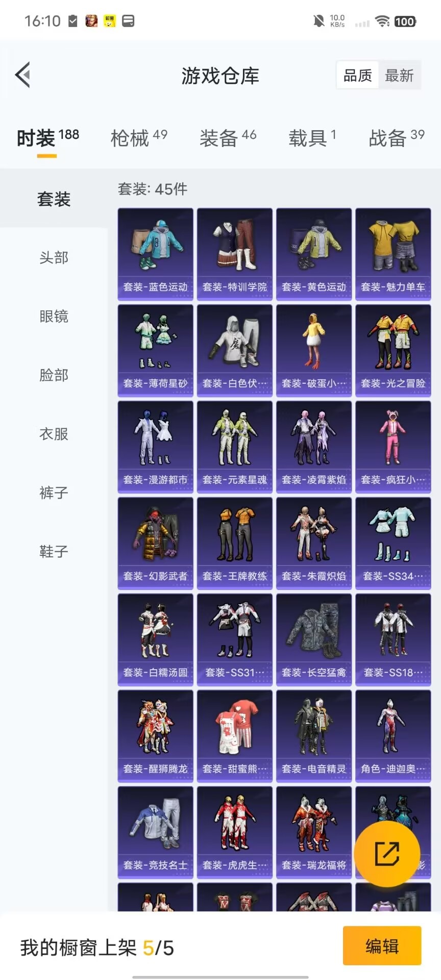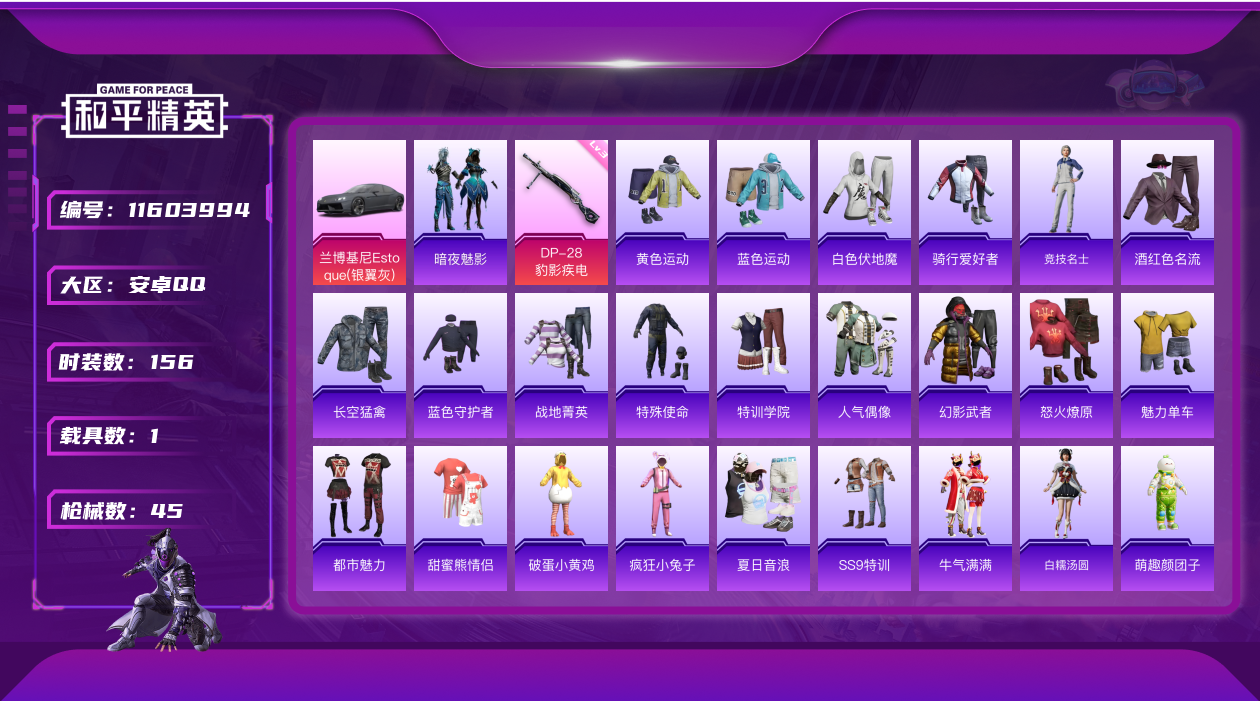 [11603994]1特效枪 1载具 2印记 可二次 可修改实名 优质装备:兰博基尼Estoque(银翼灰) 热门装扮:暗夜魅影 稀有枪皮:DP-28-豹影疾电 三级特效枪:三级DP-28-豹影疾电 紫色装扮:SS31特训套装,人气偶像,迪迦奥特曼,SS13特训,萌趣颜团子,电音精灵,瑞龙福将,团圆交子,醒狮腾龙,SS17特训,SS18特训,都市魅力,酒红色名流,长空猛禽,蓝色守护者,蓝色运动,虎虎生威吉莉,飞行日记,骑行爱好者,魅力单车,黄色运动,幻影武者,夏日音浪,怒火燎原,战地菁英,疯狂小兔子,白色伏地魔,破蛋小黄鸡,福星高照,甜蜜熊情侣,王牌教练,牛气满满,特殊使命,特训学院,竞技名士,SS9特训,白糯汤圆,光之冒险 优质战备:暗夜玫瑰降落伞