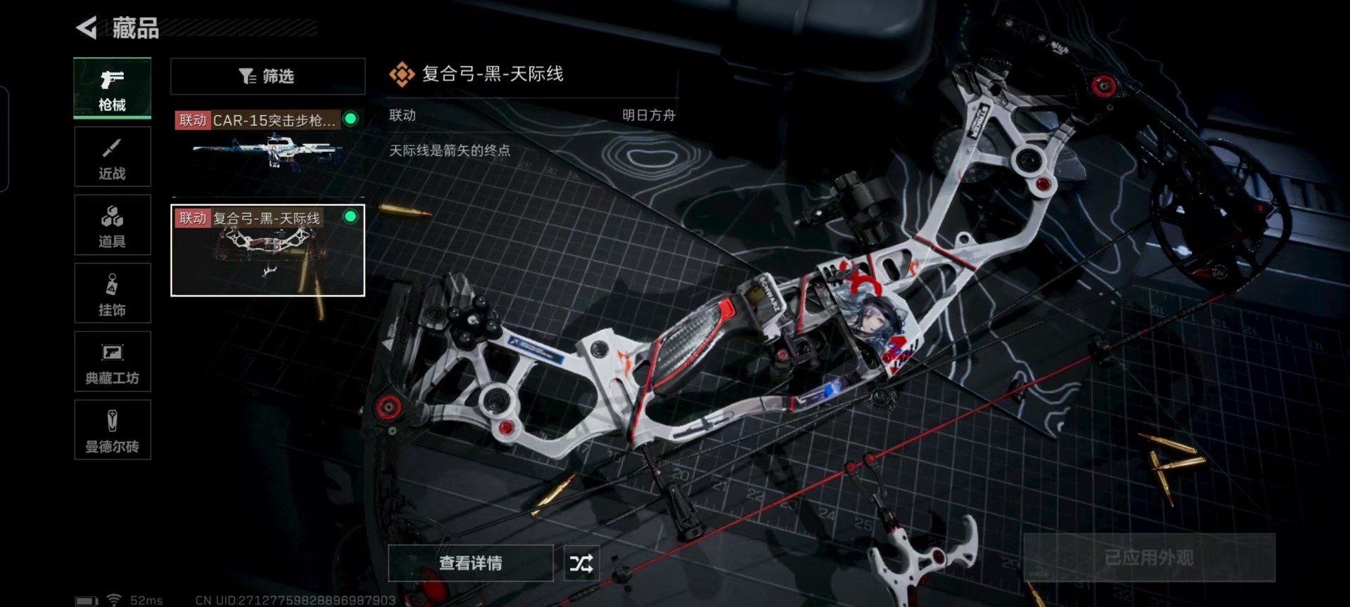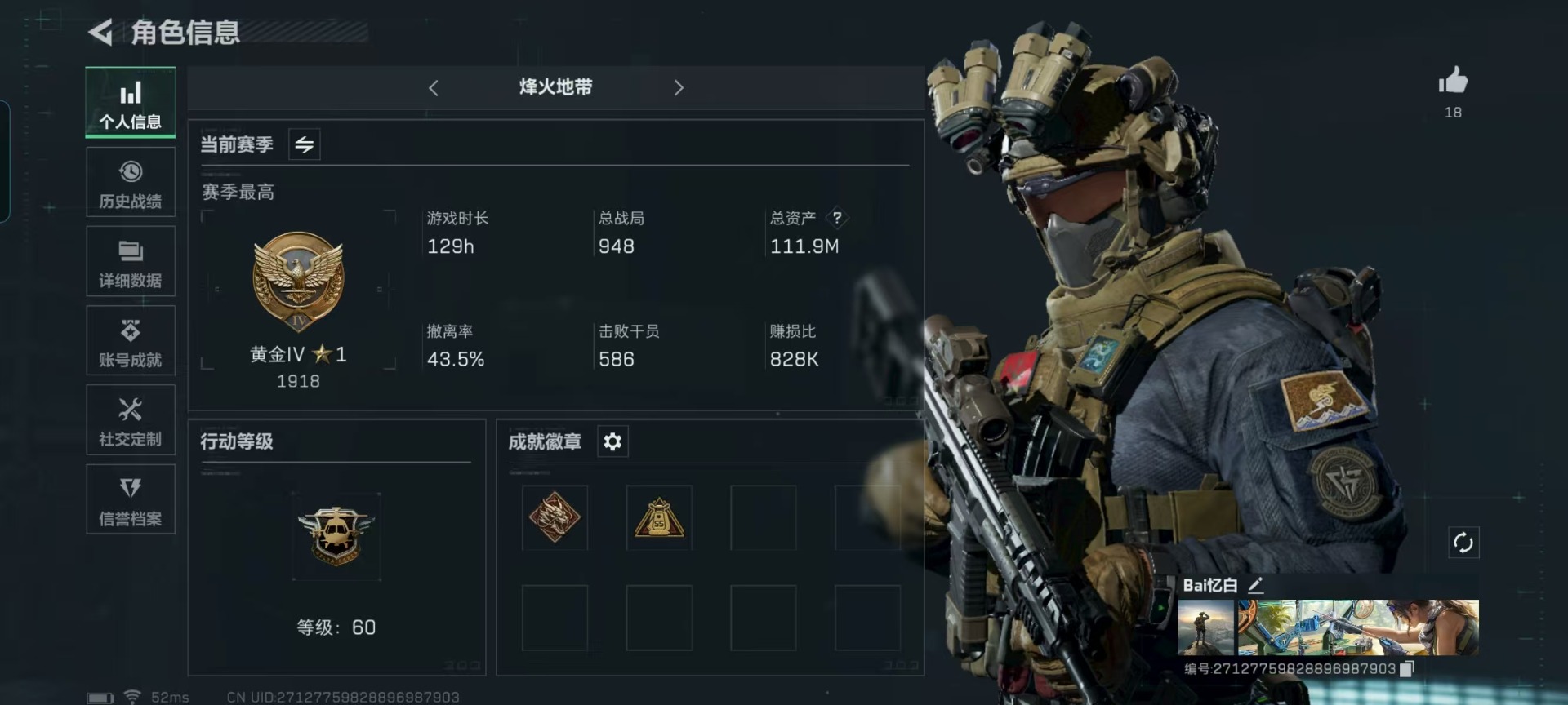 [11604037]可二次 可修改实名 实名:可修改 顶级安全箱(9.17到期) 烽火地带段位:黄金 全面战场段位:无段位 总资产:111.9 哈夫币:47.537 传说武器皮肤:复合弓-黑-天际线,CAR-15突击步枪-阿米娅