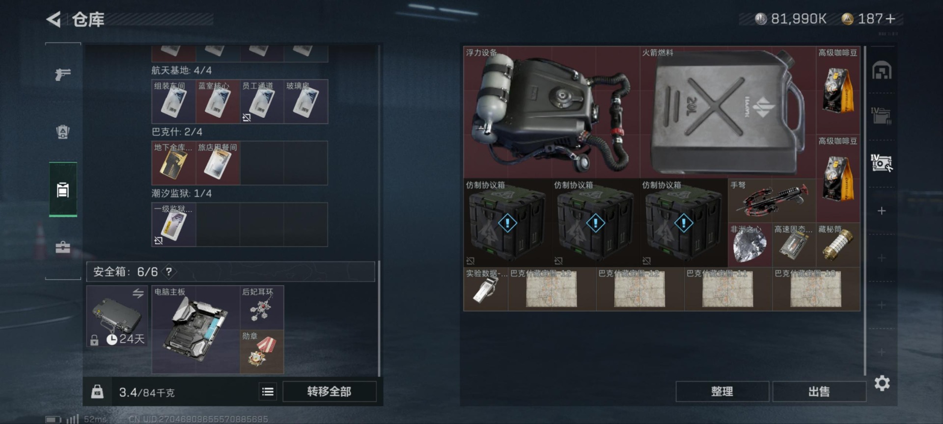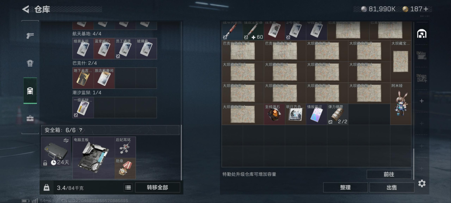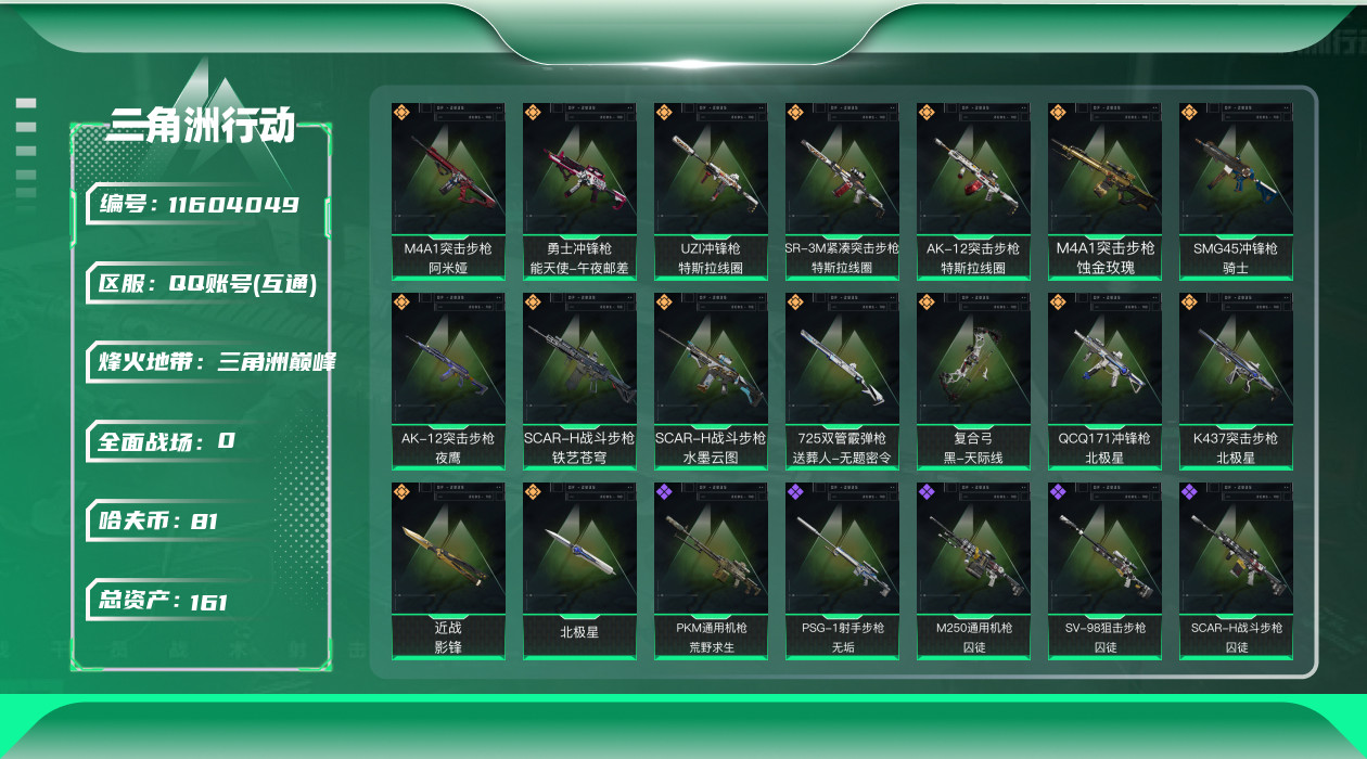 [11604049]总资产:161.2M 5干员外观 2近战传说 16传说枪械 哈夫币:81.990K 高级安全箱(2×3)9.15号到期 可二次 可修改实名 优质装备:近战-影锋,近战-北极星 烽火地带段位:三角洲巅峰 全面战场段位:上等兵 传说武器皮肤:SCAR-H战斗步枪-水墨云图,SCAR-H战斗步枪-铁艺苍穹,AK-12突击步枪-夜鹰,SMG45冲锋枪-骑士,M4A1突击步枪-阿米娅,复合弓-黑-天际线,QCQ171冲锋枪-北极星,AK-12突击步枪-特斯拉线圈,SR-3M紧凑突击步枪-特斯拉线圈,UZI冲锋枪-特斯拉线圈,勇士冲锋枪-能天使-午夜邮差,725双管霰弹枪-送葬人-无题密令,K437突击步枪-北极星,M4A1突击步枪-蚀金玫瑰 史诗武器皮肤:SR-3M紧凑突击步枪-英雄,M4A1突击步枪-特勤执行,AUG突击步枪-特勤执行,Vector冲锋枪-红色彗星,PTR-32战斗步枪-ACE,SKS射手步枪-ACE,AUG突击步枪-蝮蛇,M700狙击步枪-蝮蛇,G3战斗步枪-战场英杰,Ash-12战斗步枪-守夜人,PKM通用机枪-守夜人,SG552突击步枪-尖端治疗,SR-25射手步枪-尖端治疗,PKM通用机枪-荒野求生,勇士冲锋枪-深海恐惧,AKM突击步枪-林中猎手,M1014霰弹枪-林中猎手,PTR-32突击步枪-英雄,M250通用机枪-囚徒,SV-98狙击步枪-囚徒,SCAR-H战斗步枪-囚徒,PSG-1射手步枪-无垢,SVD狙击步枪-阿萨拉工艺,S12K霰弹枪-曙光,PKM通用机枪-英雄,QSZ92G-风林火山 干员外观:红狼-蚀金玫瑰,威龙-壮志凌云,骇爪-水墨云图,无名-夜鹰,露娜-黑·天际线
