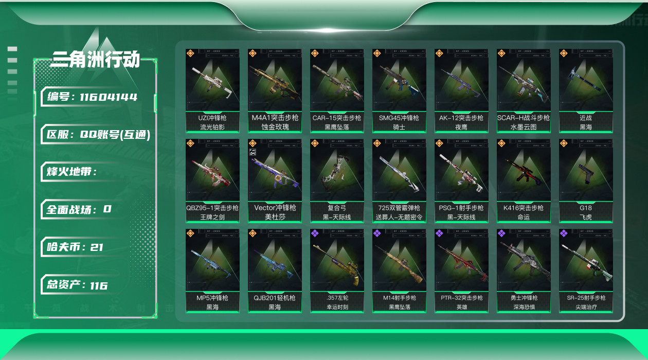 [11604144]可二次 可修改实名 实名:可修改 顶级安全箱(3×3)9.15号到期 总资产:116.9 哈夫币:21.853 传说武器皮肤:近战-黑海,QBZ95-1突击步枪-王牌之剑(典藏),Vector冲锋枪-美杜莎,K416突击步枪-命运(典藏),SCAR-H战斗步枪-水墨云图,AK-12突击步枪-夜鹰,SMG45冲锋枪-骑士,QJB201轻机枪-黑海,MP5冲锋枪-黑海,UZI冲锋枪-流光铂影,复合弓-黑-天际线,725双管霰弹枪-送葬人-无题密令,G18-飞虎,M4A1突击步枪-蚀金玫瑰,CAR-15突击步枪-黑鹰坠落,PSG-1射手步枪-黑-天际线 史诗武器皮肤:K416突击步枪-暗鸦,SMG-45冲锋枪-飓风行动,MP7冲锋枪-原型机(典藏),PSG-1射手步枪-原型机(典藏),M700狙击步枪-蝮蛇,SR-25射手步枪-尖端治疗,PKM通用机枪-荒野求生,AS Val突击步枪-尖端治疗,SG552突击步枪-尖端治疗,Ash-12战斗步枪-守夜人,SR-3M紧凑突击步枪-荒野求生,勇士冲锋枪-深海恐惧,AKM突击步枪-林中猎手,.357左轮-幸运时刻,M16A4突击步枪-竞赛选手,MP5冲锋枪-青枳,PKM通用机枪-守夜人,M1014霰弹枪-林中猎手,SV-98狙击步枪-林中猎手,PTR-32突击步枪-英雄,PSG-1射手步枪-无垢,M250通用机枪-囚徒,SCAR-H战斗步枪-囚徒,沙漠之鹰-曙光,Vector冲锋枪-阿萨拉文明,M14射手步枪-黑鹰坠落,M700狙击步枪-竞技风,G3战斗步枪-锡兰 干员外观:红狼-蚀金玫瑰,骇爪-水墨云图,威龙-飞虎,露娜-黑·天际线