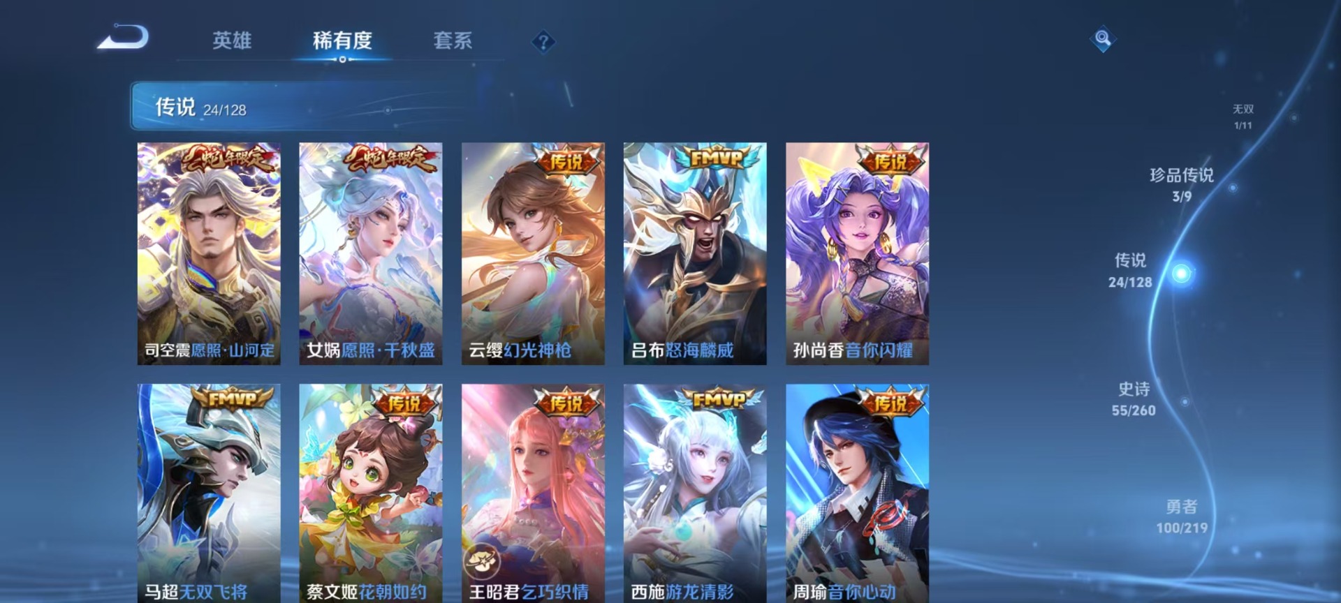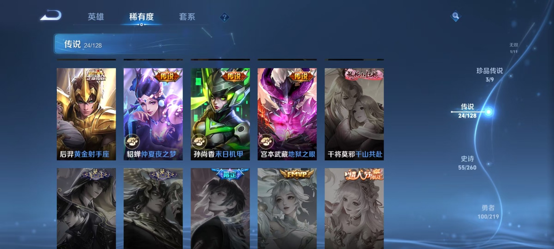- PX_2074605-35 安卓QQ/至尊星耀/203皮肤/123英雄/3典藏/0珍品无双/1无双/1珍品传说/16传说/65史诗/8稀有英雄 【1 珍品传说】时之奇旅 孙策, 【3 典藏皮肤】全息碎影 孙悟空,银白咏叹调 铠,最初的交响 伽罗, 【1 无双皮肤】器灵·螭龙剑 曜, 【16 传说皮肤】胖达荣荣 梦奇,启明星使 虞姬,零号·赤焰 孙悟空,地狱火 孙悟空,猫影幻舞 貂蝉,久胜战神 干将