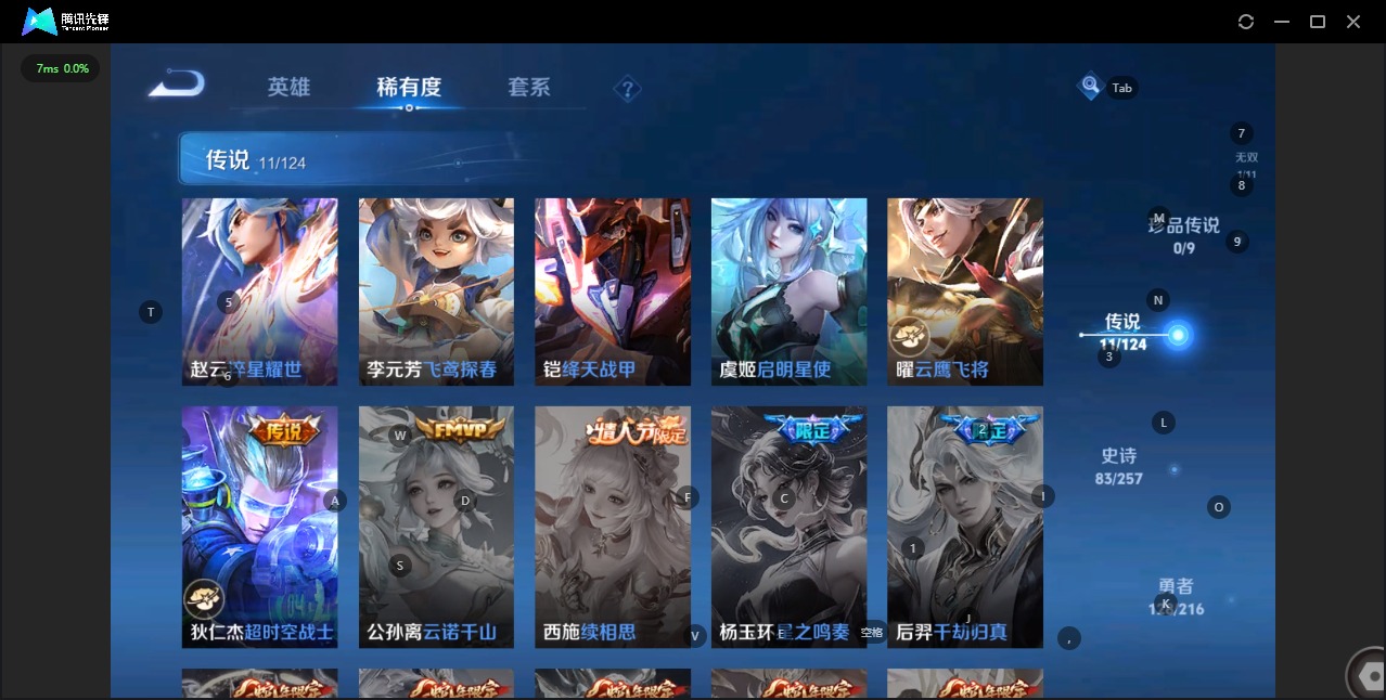 - [11527645]V7 1典藏 6传说 123英雄 155皮肤 可修改实名 优质装备:幻阙歌(貂蝉典藏),云鹰飞将(小将军),山海·苍雷引(电光曜子) 传说皮:幻光神枪 珍宝阁皮:蔷薇恋人,玩趣恶龙 限定皮:鸣野蒿,山海·碧波行(瑶年限),诗剑行,怒海麟威,五谷丰年,山海·玄木吟(马可年限),冰霜神祇 史诗皮:化蝶舞,星界战将,龙之律动,百相守梦-黄忠,苍穹之光,电玩小子(小书包),黄金分割率,特工魅影,千年之狐,江河有灵,魅语,蒙恬荣光圣徽,偶像歌手,电玩·爆裂旋风,末日机甲-吕布,猫狗日记-大乔,乱世虎臣,水果甜心,天才门将,星夜王子,心灵骇客,功夫厨神,德古拉伯爵,暗隐猎兽者,幽灵船长,鬼剑武藏,舞动绿茵,地狱岩魂,纤云弄巧,缤纷独角兽,乘风破浪,月团寄思,水晶猎龙者,金属风暴,原初追逐者,圣诞狂欢,鹰眼统帅,魅力维加斯,黎明之约,赏金猎手,无心,未来纪元-赵云