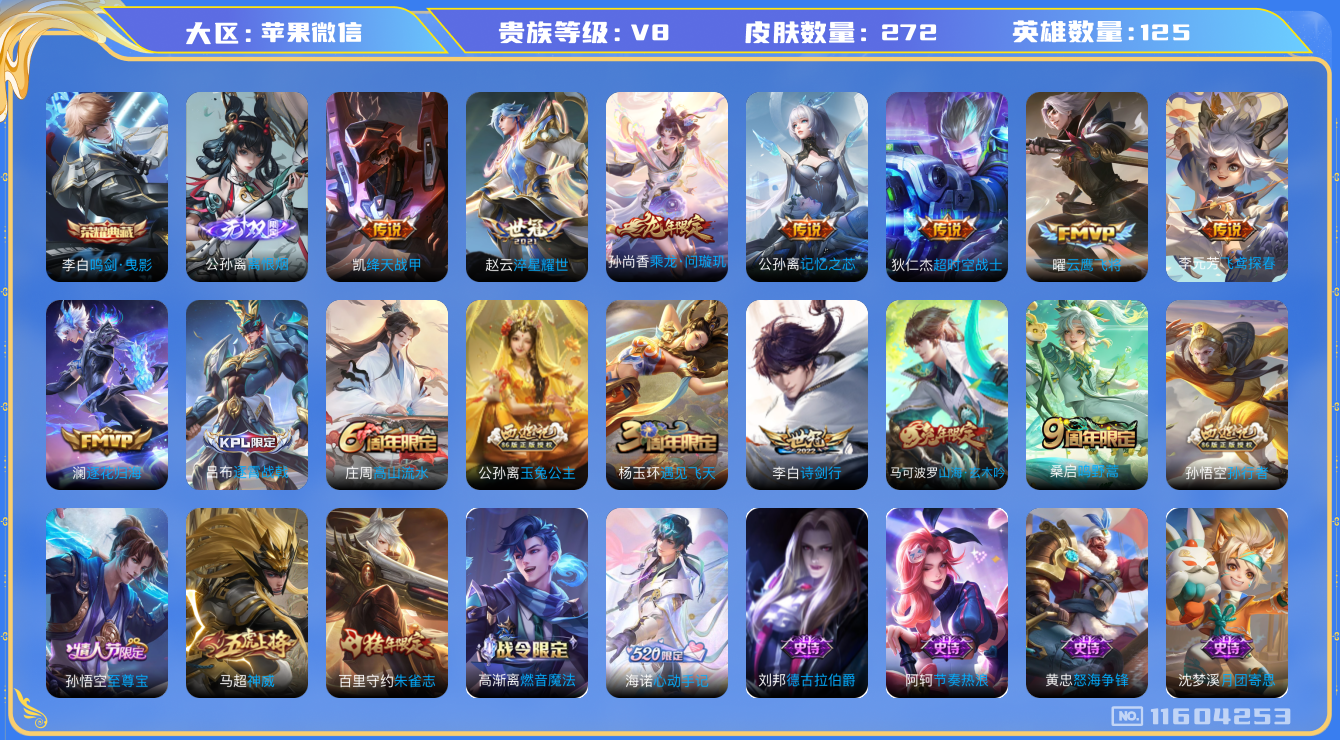 [11604253]V8 1典藏 1无双 11传说 125英雄 272皮肤 可修改实名 安全保护中 荣耀水晶:鸣剑·曳影 无双皮:离恨烟(公孙离无双) 传说皮:乘龙·问璇玑(孙尚香年限),淬星耀世,云鹰飞将(小将军),飞鸢探春,绛天战甲(鸡嘴战神),超时空战士-狄仁杰,记忆之芯(机甲兔),澜逐花归海 珍宝阁皮:妄想食味,女武神 限定皮:逐霄战戟,鸣野蒿,至尊宝,神威(电光马子),遇见飞天,高山流水,诗剑行,朱雀志(守约年限),孙行者,玉兔公主,山海·玄木吟(马可年限) 史诗皮:器灵·浮梦炉,撼地雄心,谪仙醉月,龙之律动,百相守梦-百里守约,战舞者,蒙犽顽岩魄,芈月浮光幕影,怒海争锋,海诺心动手记,决胜骁骑,蔬乡物语(鲁班七号),琥珀纪元伽罗,破空之剑,紫霞仙子,电玩小子(小书包),白龙吟,黄金分割率,特工魅影,永昼,末日机甲-莱西奥,江河有灵,高渐离燃音魔法,雪夜绮愿(周瑜),百解令(蒙犽),冰冠公主,青蛇,偶像歌手,晚萤,无限星赏官,末日机甲-吕布,猫狗日记-孙策,乱世虎臣,节奏热浪,修罗,摇滚巨星,水果甜心,天才门将,星夜王子,心灵骇客,功夫厨神,德古拉伯爵,暗隐猎兽者,幽灵船长,鬼剑武藏,天秀·启明,地狱岩魂,纤云弄巧,拒霜思,月团寄思,水晶猎龙者,曙光守护者,金属风暴,原初追逐者,圣诞狂欢,圣诞恋歌,鹰眼统帅,暗夜贵公子,魅力维加斯,黎明之约,无心,未来纪元-赵云