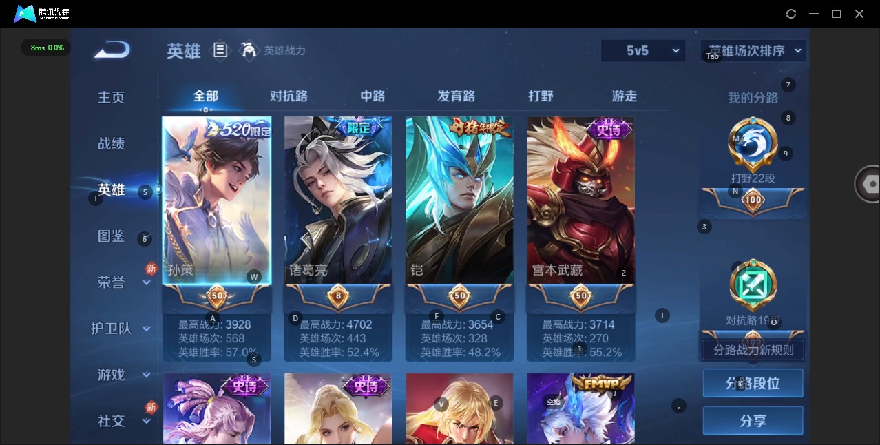 - [12175459]V5 123英雄 152皮肤 可修改实名 珍宝阁皮:优雅恋人,蔷薇恋人 限定皮:至尊宝,五谷丰年,游园惊梦,梁祝,李小龙 史诗皮:百相守梦-黄忠,特工魅影,雪夜绮愿(周瑜),猫狗日记-孙策,节奏热浪,女仆咖啡,摇滚巨星,水果甜心,星夜王子,幽灵船长,繁星吟游(呼啦呼啦),拒霜思,鹰眼统帅,未来纪元-赵云