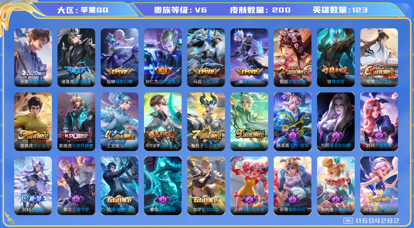 [11604282]V6 7传说 123英雄 200皮肤 可修改实名 优质装备:猫影幻舞,超时空战士-狄仁杰,挚爱之约,无双飞将,鹤羽星尊,澜逐花归海 珍宝阁皮:妄想食味,玩趣恶龙 限定皮:鸣野蒿,高山流水,五谷丰年,青龙志(铠年限),游园惊梦,梁祝,天狼狩猎者,李小龙,山海·玄木吟(马可年限) 史诗皮:化蝶舞,星界特工,星界战将,百相守梦-黄忠,黄金分割率,特工魅影,千年之狐,电玩·爆裂旋风,江河有灵,蒙恬荣光圣徽,冰冠公主,末日机甲-吕布,猫狗日记-孙策,节奏热浪,摇滚巨星,水果甜心,天才门将,星夜王子,德古拉伯爵,幽灵船长,鬼剑武藏,心灵战警,天秀·启明,舞动绿茵,繁星吟游(呼啦呼啦),缤纷独角兽,逐浪之夏,水晶猎龙者,曙光守护者,箭羽风息,金属风暴,原初追逐者,圣诞狂欢,圣诞恋歌,鹰眼统帅,天秀·音浪,无心,未来纪元-赵云