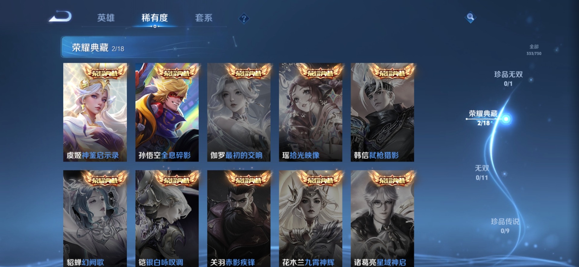 后羿辉光之辰,露娜一生所爱,裴擒虎李小龙,裴擒虎天狼狩猎者,上官婉儿梁祝,上官婉儿天狼绘梦者,桑启鸣野蒿,孙悟空大圣娶亲,孙悟空至尊宝,百里玄策白虎志,雅典娜神奇女侠,赵云引擎之心,韩信飞衡,百里守约朱雀志,澜愿照·九州拓