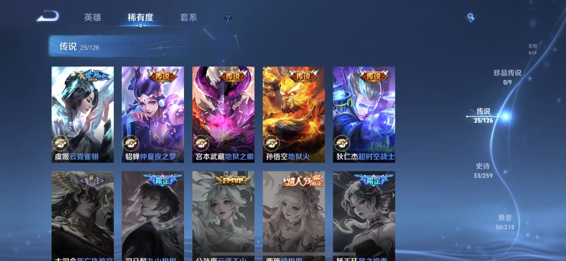 - PX_2109991-Q/至尊星耀/238皮肤/125英雄/1典藏/0珍品无双/1无双/3珍品传说/14传说/77史诗/9稀有英雄 【3 珍品传说】酷洛米之心 安琪拉,大耳狗之梦 瑶,怪盗基德 马可波罗, 【1 典藏皮肤】拾光映像 瑶, 【1 无双皮肤】时之魔女 小乔, 【14 传说皮肤】鹤归松栖 云缨,永恒水手月亮 王昭君,启明星使 虞姬,逐花归海 澜,游龙清影 西施,仲夏夜之梦 貂蝉,乞巧织情