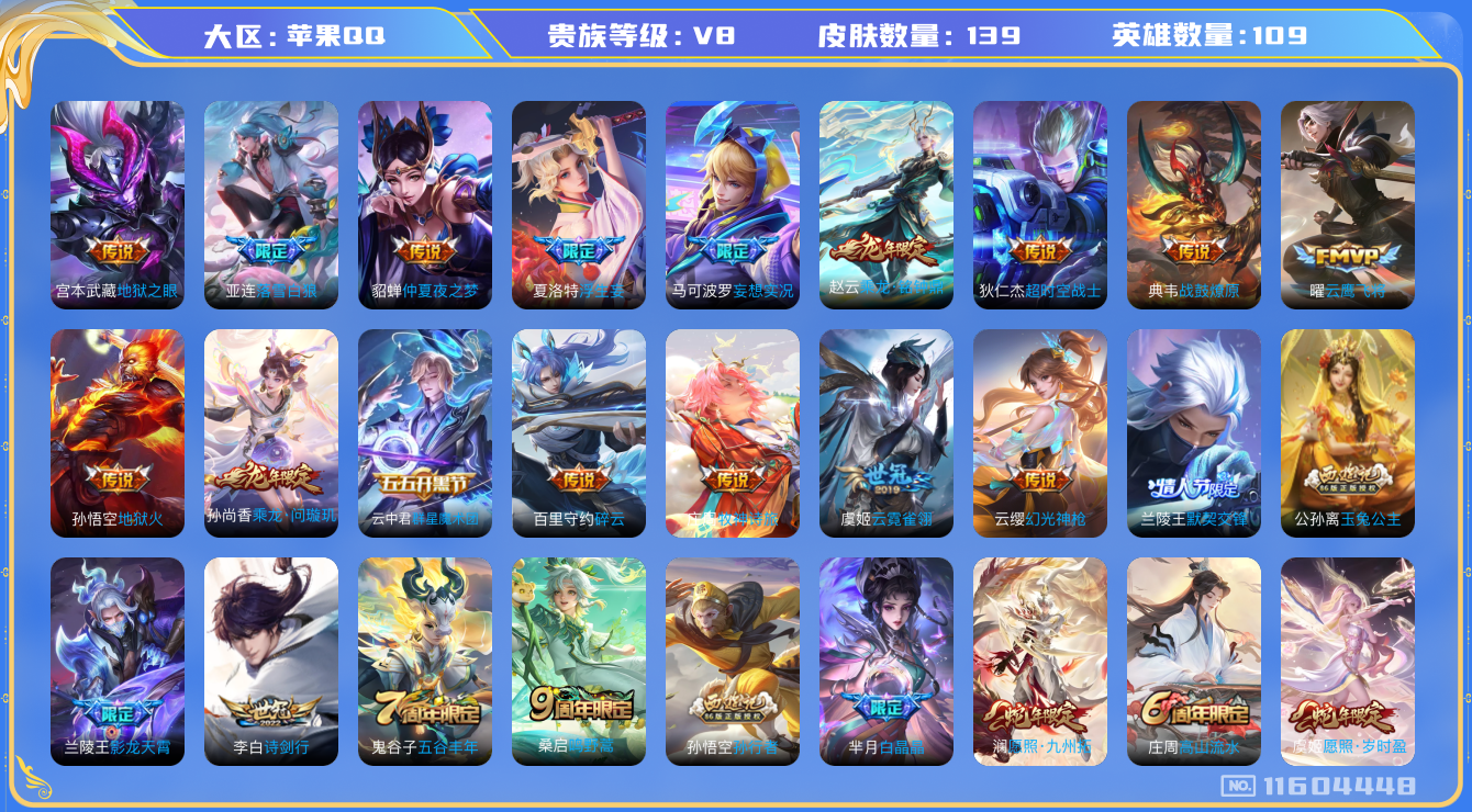 [11604448]V8 25传说 109英雄 139皮肤 可修改实名 优质装备:云鹰飞将(小将军),云霓雀翎,地狱火,仲夏夜之梦(大飞蛾),地狱之眼,超时空战士-狄仁杰,碎云,浮生妄,妄想实况,云中君群星魔术团,牧神诗旅 传说皮:乘龙·问璇玑(孙尚香年限),乘龙·铭钟鼎(赵云年限),典韦战鼓燎原,落雪白狼,幻光神枪 珍宝阁皮:蔷薇恋人 限定皮:愿照·九州拓(澜年限),愿照·岁时盈(虞姬年限),映山客,鸣野蒿,白晶晶,时雨天司(水龙头),影龙天霄,高山流水,诗剑行,五谷丰年,默契交锋-兰陵王,孙行者,玉兔公主 史诗皮:器灵·浮梦炉,化蝶舞,雪豹·霜爪,乘龙·忆丹青(大乔年限),琥珀纪元伽罗,黄金分割率,特工魅影,永昼,百相守梦(刘备),电玩·爆裂旋风,高渐离燃音魔法,晚萤,猫狗日记-孙策,时之恋人-孙尚香,女仆咖啡,暗隐猎兽者,幽灵船长,诗语江南,纤云弄巧,乘风破浪,鹰眼统帅,魅力维加斯