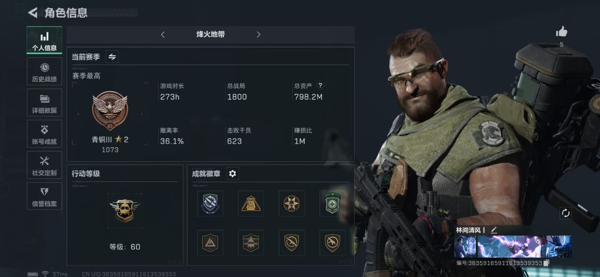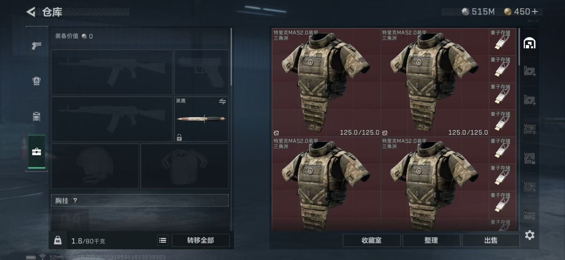 - [10444638]总资产115M,哈夫币5180w,枪皮数量40,战场等级:1 无军衔,行动等级:49 黑鹰