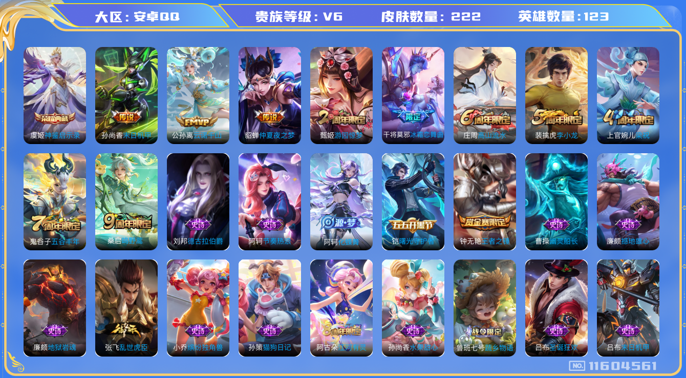[11604561]V6 1典藏 4传说 123英雄 222皮肤 可修改实名 荣耀水晶:神鉴启示录 传说皮:云诺千山,仲夏夜之梦(大飞蛾),末日机甲-孙尚香(绿蚂蚱) 珍宝阁皮:优雅恋人,女武神,玩趣恶龙 限定皮:鸣野蒿,高山流水,五谷丰年,游园惊梦,梁祝,李小龙,冰霜恋舞曲 史诗皮:撼地雄心,龙之律动,蒙犽顽岩魄,星界特工,蔬乡物语(鲁班七号),化蝶舞,破空之剑,黄金分割率,特工魅影,千年之狐,江河有灵,冰冠公主,无限星赏官,龙骑士(小龙虾),末日机甲-吕布,猫狗日记-孙策,乱世虎臣,节奏热浪,女仆咖啡,摇滚巨星,水果甜心,绅士熊喵,天才门将,星夜王子,时之奇旅-安琪拉,德古拉伯爵,暗隐猎兽者,幽灵船长,鬼剑武藏,地狱岩魂,缤纷独角兽,逐浪之夏,曙光守护者,金属风暴,圣诞狂欢,圣诞恋歌,鹰眼统帅,王者之锤,暗夜贵公子,奇遇舞章,无心,未来纪元-赵云