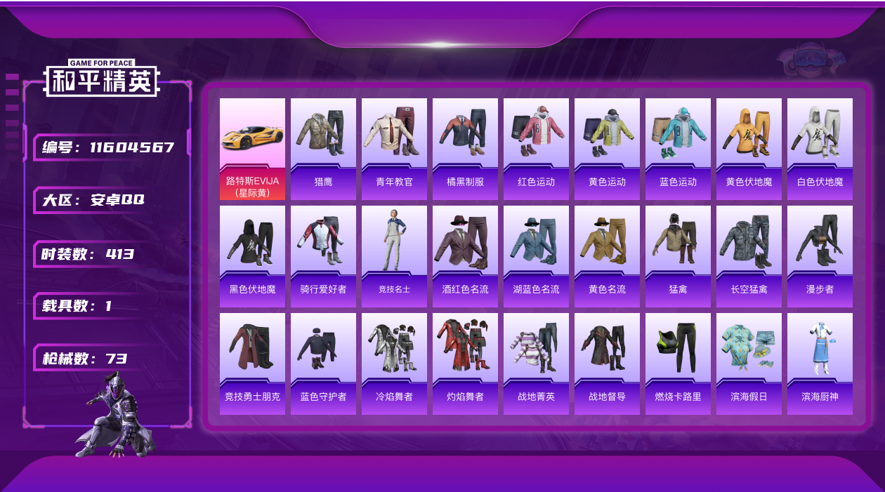 - PX_2090922- 可二次 安卓手Q-13王牌印记-4粉装-8特效枪-0载具-68407热力值-169套装-201枪皮-0卓越印记-0传奇印记 【4粉装】,洛天依,时空协奏·和音,守护天翼,绚金战神 【8特效枪】,AKM-炫紫旋律-7级 SCAR-L-锦绣绵绵-5级 M416-五爪金龙-7级 GROZA-镜光银凌-5级 AUG-暖羊咩咩-5级 Kar98K-巳巳如意-5级 UMP45-量子极限