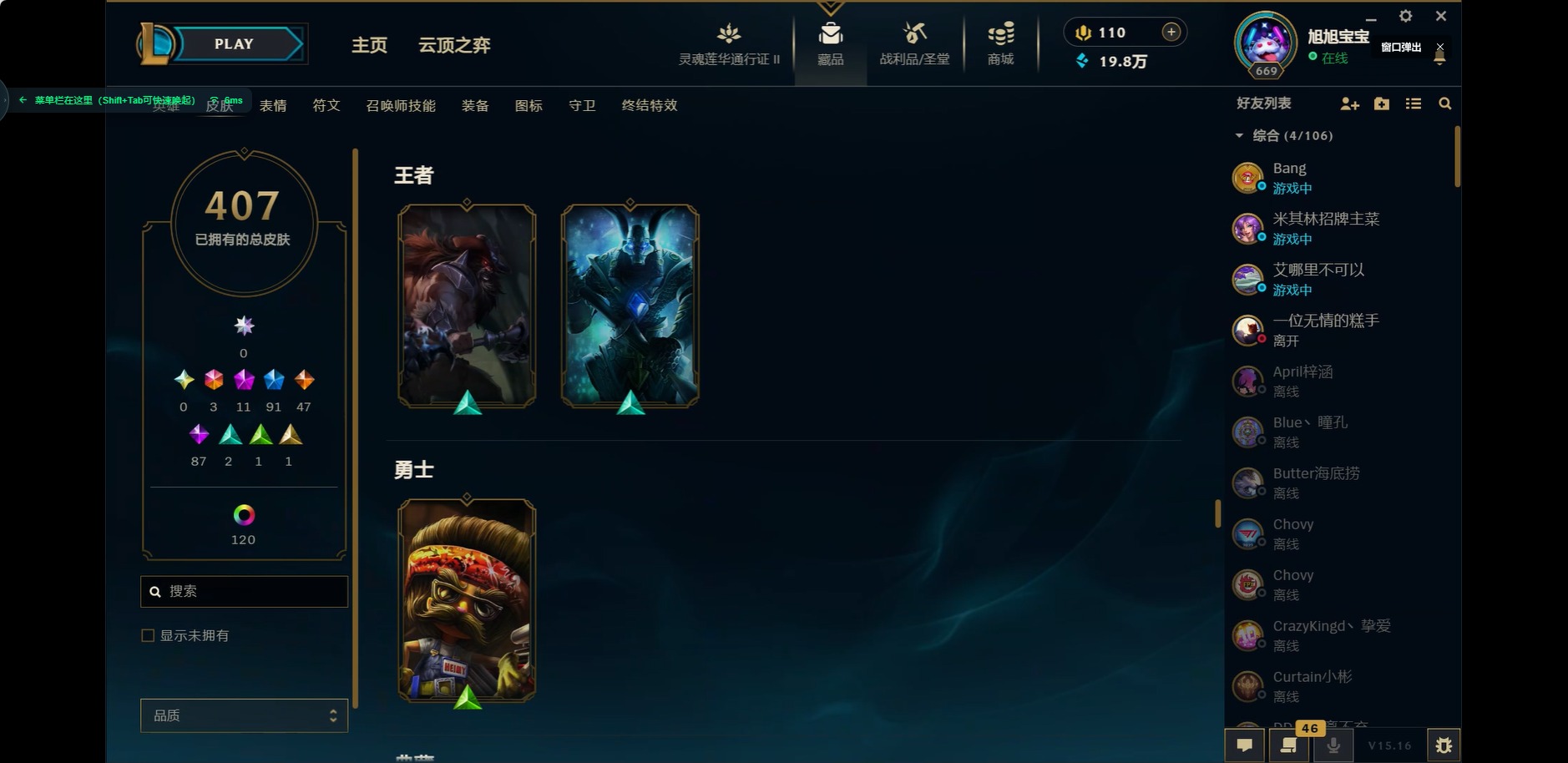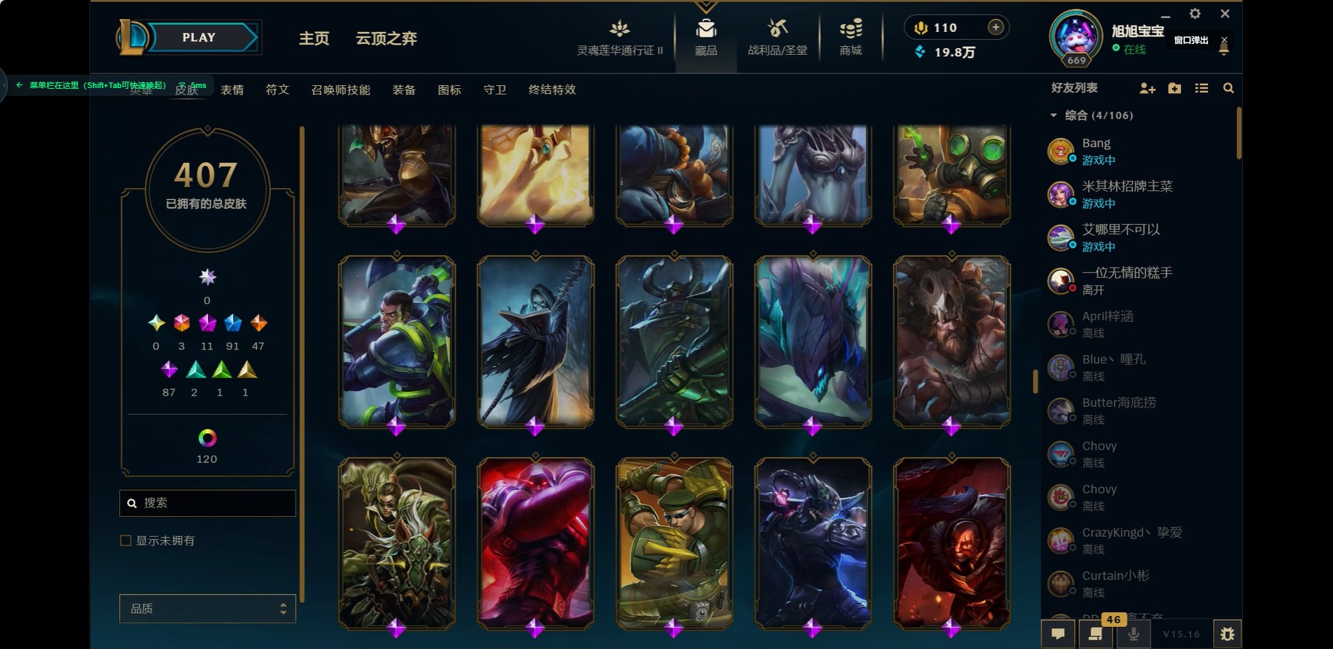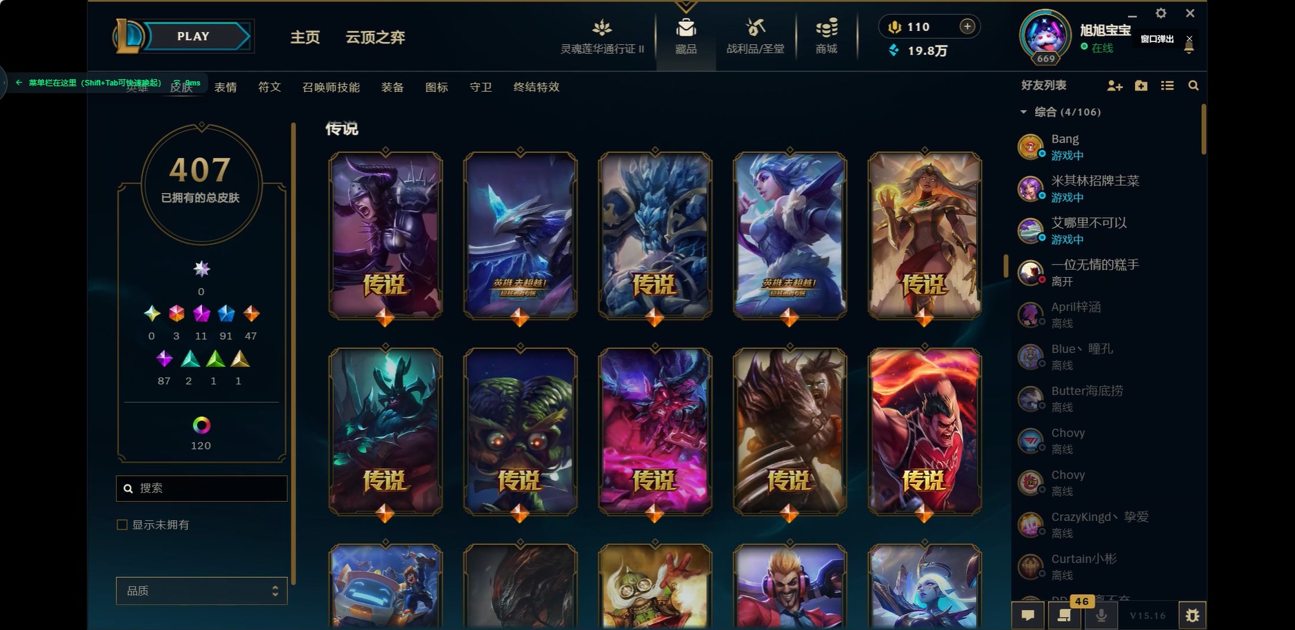 [11604599]可二次 可修改实名 3终极 11神话 5臻彩 90限定 47传说 87史诗 407皮肤 153炫彩 171英雄 铂金 皮肤:天龙之子 斯莫德,灵魂莲华 莉莉娅,腥红之月 派克,星之守护者 妮蔻,绝息圣堂 洛,永恒之森 巴德,SKT T1 卡莉丝塔,冠军之矛 卡莉丝塔,灌篮高手 艾翁,永恒之森 雷克塞,腥红之月 锤石,冠军典狱长 锤石,深渊恐惧 锤石,太空律动 “音浪狂舞” 莎弥拉,魅惑女巫 悠米,司马懿 仲达,SKT T1 阿兹尔,幽冥领主 阿兹尔,源代码 娜美,鲛妮座人 娜美,胜利之剑 亚托克斯,炼狱魔女 蔚,任性学霸 艾克,胜利枪神 卢锡安,源计划:雷 卢锡安,职业杀手 卢锡安,海牛大大 塔姆,觅心萝莉 金克丝,源计划:疯狂 金克丝,星之守护者 金克丝,丧尸杀手 金克丝,黑帮管家 布隆,屠龙勇士 布隆,荣誉使者 阿克尚,这货不是维克兹,神龙尊者 夜月幻龙 亚索,黑夜使者 亚索,腥红之月 亚索,源计划:风 亚索,西部牛仔 亚索,泳池派对 扎克,邪恶魔人 扎克
