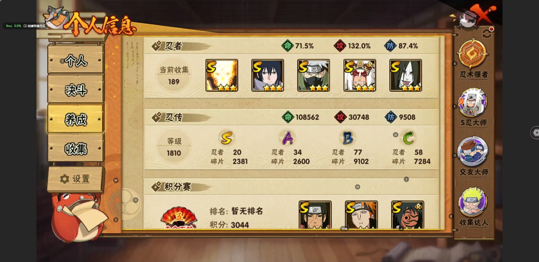 [11604622]V11 20S忍 34A忍 17通灵 648.8W战力 可二次 可修改实名 优质装备:熊猫,千手柱间「秽土转生」,宇智波鼬「秽土转生」,药师兜「仙人模式」,宇智波斑 「木叶创立」,迈特凯「死门」,宇智波带土 「忍界大战」,“宇智波斑” 「白面具」,漩涡鸣人 「九喇嘛连结」,神秘面具男 「红夜之刃」,宇智波佐助「永恒万花筒」,千手柱间·木叶创立,宇智波斑「秽土转生·解」,大筒木桃式,艾「忍界大战」,旗木卡卡西「须佐能乎」 S级忍者:自来也 「舞之豪杰」,宇智波鼬 「须佐能乎」,佩恩「天道」,波风水门,大蛇丸