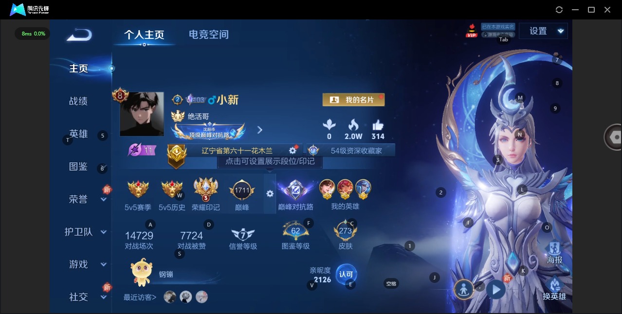 [11604691]V8 2典藏 13传说 125英雄 273皮肤 可修改实名 优质装备:鸣剑·曳影,九霄神辉(木兰典藏),绛天战甲(鸡嘴战神),炽阳神光,末日机甲-孙尚香(绿蚂蚱),地狱火,仲夏夜之梦(大飞蛾),超时空战士-狄仁杰,澜逐花归海 传说皮:云诺千山 珍宝阁皮:优雅恋人,蔷薇恋人,女武神 限定皮:至尊宝,武陵仙君(小桃花),时雨天司(水龙头),飞衡(韩信年限),遇见飞天,高山流水,游园惊梦,梁祝,李小龙,朱雀志(守约年限),永曜之星,辉光之辰,如梦令-后羿,霸王别姬-虞姬,孙行者,猪悟能,青春决赛季,寅虎·瑞焰(虎皮蛋子) 史诗皮:灵蛊蚀心,龙之律动,石田雨龙,百相守梦-周瑜,琥珀纪元伽罗,百相守梦-黄忠,紫霞仙子,苍穹之光,白龙吟,黄金分割率,千年之狐,江河有灵,百解令(蒙犽),高渐离燃音魔法,魅语,冰冠公主,猫狗日记-孙策,乱世虎臣,节奏热浪,女仆咖啡,水果甜心,天才门将,时之奇旅-安琪拉,德古拉伯爵,暗隐猎兽者,幽灵船长,鬼剑武藏,心灵战警,舞动绿茵,地狱岩魂,纤云弄巧,拒霜思,逐浪之夏,水晶猎龙者,金属风暴,原初追逐者,圣诞狂欢,圣诞恋歌,鹰眼统帅,王者之锤,暗夜贵公子,魅力维加斯,黎明之约,奇遇舞章,未来纪元-赵云