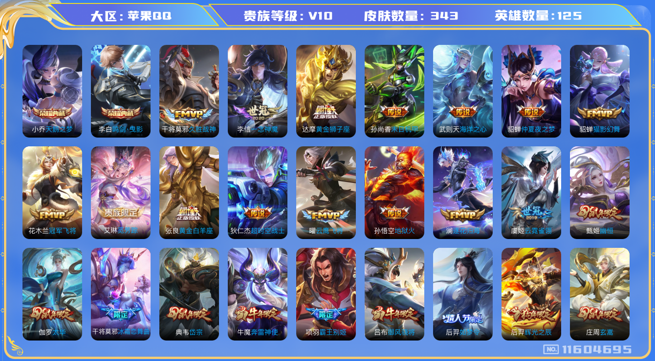 [11604695]V10 2典藏 23传说 125英雄 343皮肤 典藏英雄武则天 可修改实名 优质装备:天鹅之梦(小乔典藏),鸣剑·曳影,黄金狮子座,冠军飞将,云鹰飞将(小将军),黄金白羊座,猫影幻舞,久胜战神,一念神魔,云霓雀翎,末日机甲-孙尚香(绿蚂蚱),地狱火,仲夏夜之梦(大飞蛾),海洋之心,超时空战士-狄仁杰,澜逐花归海,艾琳觅芳踪 珍宝阁皮:妄想食味,女武神 限定皮:鸣野蒿,至尊宝,凤求凰(白切鸡),凤凰于飞,太华(伽罗年限),时之彼端,白晶晶,时雨天司(水龙头),飞衡(韩信年限),玄嵩(庄周年限),遇见飞天,冰锋战神,幽恒(沐浴露),梁祝,御风骁将(吕布年限),逐梦之星,岱宗(典韦年限),奔雷神使(牛魔年限),祈雪灵祝(雪兔子),天狼绘梦者,李小龙,逐梦之光,永曜之星,辉光之辰,如梦令-嫦娥,如梦令-后羿,霸王别姬-项羽,霸王别姬-虞姬,奇迹圣诞,默契交锋-兰陵王,默契交锋-花木兰,引擎之心,冰霜恋舞曲,热情桑巴,美猴王 史诗皮:鸭鸭历险记-刘禅,遇见神鹿,紫霞仙子,电玩小子(小书包),白龙吟,黄金分割率,特工魅影,千年之狐,偶像歌手,龙骑士(小龙虾),白蛇,暗夜猫娘,魅语,无限星赏官,晚萤,冰冠公主,青蛇,末日机甲-吕布,猫狗日记-孙策,猫狗日记-大乔,时之恋人-孙尚香,乱世虎臣,节奏热浪,修罗,女仆咖啡,摇滚巨星,水果甜心,绅士熊喵,天才门将,星夜王子,心灵骇客,功夫厨神,德古拉伯爵,暗隐猎兽者,幽灵船长,鬼剑武藏,心灵战警,舞动绿茵,地狱岩魂,纤云弄巧,繁星吟游(呼啦呼啦),缤纷独角兽,乘风破浪,逐浪之夏,龙鼓争鸣,水晶猎龙者,曙光守护者,热力回旋,箭羽风息,金属风暴,原初追逐者,圣诞狂欢,圣诞恋歌,鹰眼统帅,暗夜贵公子,魅力维加斯,未来纪元-赵云