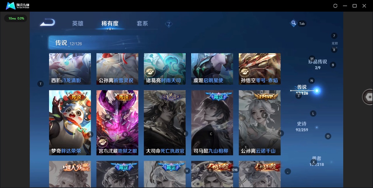 - [11632261]V7 3传说 123英雄 226皮肤 可修改实名 优质装备:云霓雀翎 珍宝阁皮:优雅恋人,蔷薇恋人 限定皮:愿照·岁时盈(虞姬年限),愿照·众生和(妲己年限),至尊宝,傲雪梅枪,遇见飞天,高山流水,五谷丰年,岱宗(典韦年限),逐梦之音,李小龙,猪悟能 史诗皮:鸭鸭历险记-刘禅,化蝶舞,龙之律动,石田雨龙,茶境仙,怒海争锋,遇见神鹿,白龙吟,特工魅影,江河有灵,高渐离燃音魔法,偶像歌手,龙骑士(小龙虾),末日机甲-吕布,猫狗日记-孙策,猫狗日记-大乔,女仆咖啡,水果甜心,绅士熊喵,心灵骇客,功夫厨神,鬼剑武藏,纤云弄巧,繁星吟游(呼啦呼啦),拒霜思,缤纷独角兽,逐浪之夏,曙光守护者,唤灵魅影,原初追逐者,圣诞狂欢,圣诞恋歌,鹰眼统帅,魅力维加斯,黎明之约,未来纪元-赵云