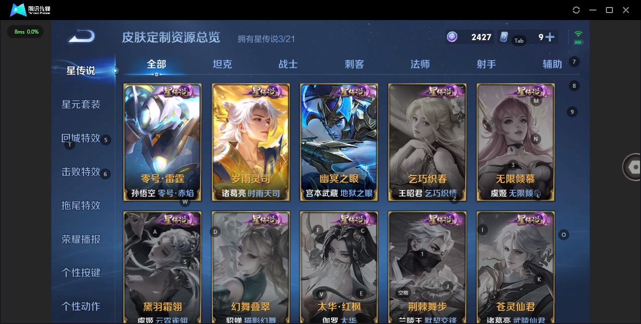 [11604768]V8 1典藏 2珍品传说 12传说 124英雄 336皮肤 可修改实名 优质装备:弑枪猎影(韩信典藏),器灵·落星盏,零号·赤焰,地狱之眼,胖达荣荣,游龙清影(小青龙),山海·炽霜斩(李信年限),澜逐花归海 珍品传说:时之奇旅-孙策 珍宝阁皮:优雅恋人,玩趣恶龙 限定皮:愿照·九州拓(澜年限),逐霄战戟,鸣野蒿,至尊宝,时雨天司(水龙头),神威(电光马子),飞衡(韩信年限),遇见飞天,齐天大圣,五谷丰年,青龙志(铠年限),冰锋战神,天狼运算者,梁祝,岱宗(典韦年限),祈雪灵祝(雪兔子),李小龙,逐梦之影,默契交锋-花木兰,孙行者,引擎之心,山海·玄木吟(马可年限) 史诗皮:鸭鸭历险记-刘禅,器灵·浮梦炉,化蝶舞,星界战将,龙之律动,石田雨龙,茶境仙,破空之剑,战舞者,东方月初,蒙犽顽岩魄,怒海争锋,谪仙醉月,蔬乡物语(鲁班七号),百相守梦-百里守约,紫霞仙子,苍穹之光,白龙吟,黄金分割率,特工魅影,千年之狐,永昼,百解令(蒙犽),偶像歌手,白蛇,暗夜猫娘,魅语,猫狗日记-孙策,猫狗日记-大乔,乱世虎臣,节奏热浪,修罗,水果甜心,星夜王子,心灵骇客,功夫厨神,德古拉伯爵,暗隐猎兽者,幽灵船长,鬼剑武藏,暗渊魔法,心灵战警,乐园奇幻夜,天秀·启明,舞动绿茵,地狱岩魂,诗语江南,纤云弄巧,繁星吟游(呼啦呼啦),拒霜思,缤纷独角兽,乘风破浪,逐浪之夏,水晶猎龙者,曙光守护者,箭羽风息,金属风暴,原初追逐者,圣诞狂欢,圣诞恋歌,鹰眼统帅,魅力维加斯,黎明之约,无心,未来纪元-赵云