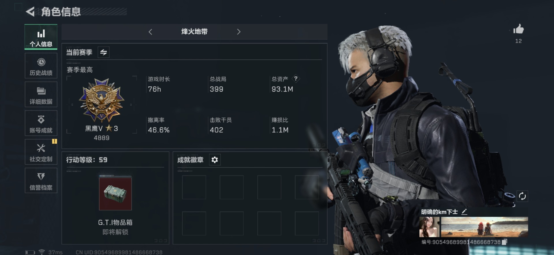 [11604772]总资产:93.1M 1干员外观 11传说枪械 哈夫币:19.577K 高级安全箱(2×3)9.15号到期 可二次 可修改实名 烽火地带段位:黑鹰 全面战场段位:无段位 传说武器皮肤:M16A4突击步枪-狩猎时刻,AWM狙击步枪-捞点薯条,腾龙突击步枪-捞点薯条,93R-捞点薯条,勇士冲锋枪-能天使-午夜邮差,Vector冲锋枪-狩猎时刻,G3战斗步枪-狩猎时刻,复合弓-黑-天际线,725双管霰弹枪-送葬人-无题密令,M4A1突击步枪-阿米娅,CAR-15突击步枪-阿米娅 干员外观:蜂医-送葬人·无题密令(S5)