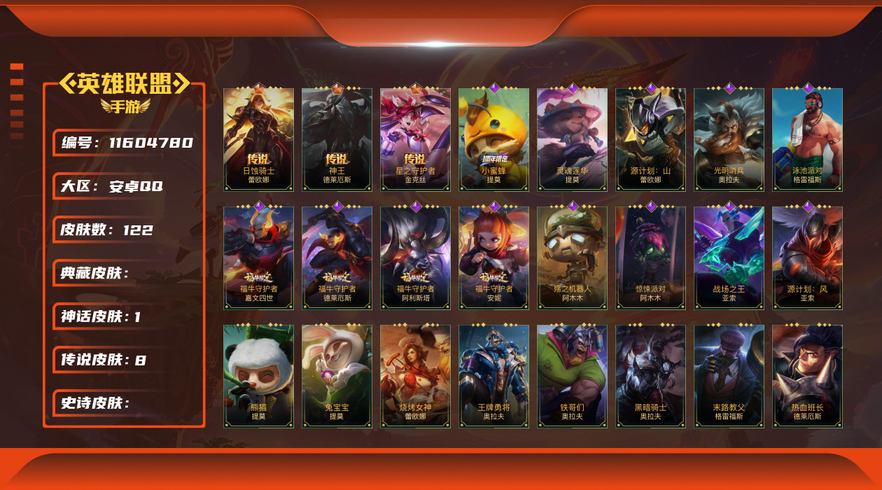 [11604780]可二次 可修改实名 1神话 8传说 39史诗 122皮肤 127英雄 翡翠 皮肤:提莫-小蜜蜂,提莫-灵魂莲华,提莫-熊猫,提莫-兔宝宝,蕾欧娜-烧烤女神,蕾欧娜-日蚀骑士,蕾欧娜-源计划:山,奥拉夫-王牌勇将,奥拉夫-光明哨兵,奥拉夫-铁哥们儿,格雷福斯-黑暗骑士,格雷福斯-泳池派对,格雷福斯-末路教父,德莱厄斯-福牛守护者,德莱厄斯-热血班长,德莱厄斯-神王,阿木木-小小骑士,阿木木-殇之机器人,阿木木-惊悚派对,嘉文四世-王牌上将,嘉文四世-福牛守护者,嘉文四世-孤胆英豪,蔚-双城之战,蔚-女警官,蔚-铁拳执事,金克丝-双城之战,金克丝-星之守护者,金克丝-光耀之芒,亚索-战场之王,亚索-西部牛仔,亚索-源计划:风,崔斯特-王牌舰长,崔斯特-探戈灵魂,阿利斯塔-福牛守护者,阿利斯塔-哞利斯塔,安妮-福牛守护者,安妮-冰霜烈焰,库奇-冠翎飞行员,库奇-海牛骑手,希瓦娜-银河魔装机神,希瓦娜-冰霜亚龙