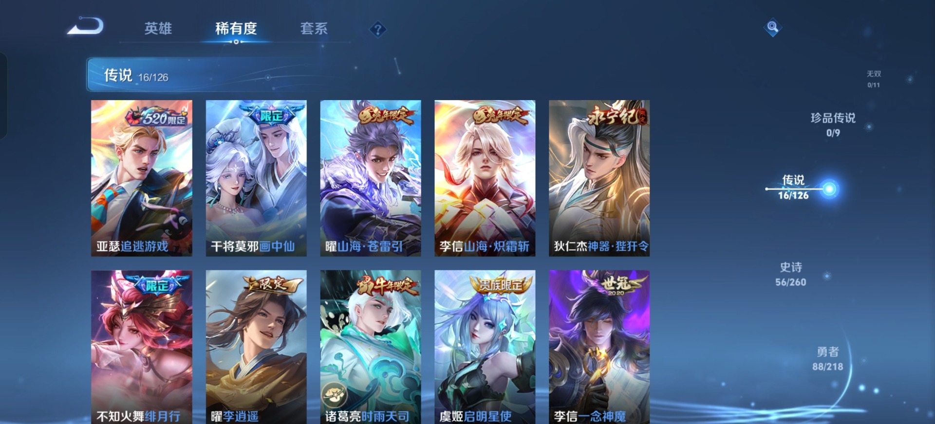 - [12264974]V10 3典藏 3无双 5珍品传说 52传说 126英雄 494皮肤 典藏英雄武则天 可修改实名 优质装备:天鹅之梦(小乔典藏),幻阙歌(貂蝉典藏),真我赫兹(瑶)(瑶无双),小乔时之魔女(小乔无双),拾光映像(瑶典藏),雪境奇遇-甄姬,江户川柯南,器灵·落星盏,大耳狗之梦,朽木白哉,云鹰飞将(小将军),黄金白羊座,云霓雀翎,末日机甲-孙尚香(绿蚂蚱),地狱火,仲夏夜之梦(大飞蛾),音你心动-小乔,海洋之心,游龙清影(小青龙),淬星耀世,超时空战士-狄仁杰,遇见胡旋,无双飞将,山海·炽霜斩(李信年限),画中仙,浮生妄,百相守梦(张飞),电玩·雷克斯,遇见神鼓,大乔-时之奇旅,永恒水手月亮,小动物乐团,澜逐花归海,艾琳觅芳踪,琥珀纪元铠,玄雷天君,千劫归真,涂山容容 珍品传说:时之奇旅-孙策 传说皮:乘龙·问璇玑(孙尚香年限),续相思,星之鸣奏,祥瑞亨通 珍宝阁皮:胡桃夹子,万物之道,优雅恋人,蔷薇恋人,玩趣恶龙 限定皮:愿照·九州拓(澜年限),愿照·福禄聚(蔡文姬年限),愿照·岁时盈(虞姬年限),愿照·山河定(司空震年限),愿照·众生和(妲己年限),愿照·千秋盛(女娲年限),映山客,陌上桑,鸣野蒿,凤凰于飞,太华(伽罗年限),傲雪梅枪,补天,绯月行,白鹤梁神女,白晶晶,时雨天司(水龙头),玄嵩(庄周年限),无限倾心-项羽,至美·乘鲤谣,遇见飞天,高山流水,诗剑行,无限倾心-虞姬,怒海麟威,五谷丰年,天狼运算者,游园惊梦,梁祝,虎魄,奔雷神使(牛魔年限),祈雪灵祝(雪兔子),李小龙,逐梦之光,如梦令-嫦娥,如梦令-后羿,霸王别姬-项羽,霸王别姬-虞姬,奇迹圣诞,默契交锋-花木兰,一生所爱,大圣娶亲,寅虎·瑞焰(虎皮蛋子),寅虎·心曲(虎婆),时之祈愿-瑶(瑶传限),玉兔公主,深海之息(深海大菠萝),唐三藏,时之奇旅-妲己,冰霜神祇 史诗皮:鸭鸭历险记-刘禅,器灵·浮梦炉,狼魂孤将,绮世丹青,化蝶舞,灵蛊蚀心,星界战将,龙之律动,小牛鸭,石田雨龙,百相守梦-周瑜,茶境仙,幻珠鲛人,破空之剑,涂山红红,蒙犽顽岩魄,琥珀纪元伽罗,上官婉儿群星魔术团,奇遇星旅,蔬乡物语(鲁班七号),乘龙·聚宝船(安琪拉年限),乘龙·忆丹青(大乔年限),百相守梦-百里守约,百相守梦-黄忠,织梦人,守夜人,紫霞仙子,苍穹之光,电玩小子(小书包),黄金分割率,特工魅影,千年之狐,永昼,江河有灵