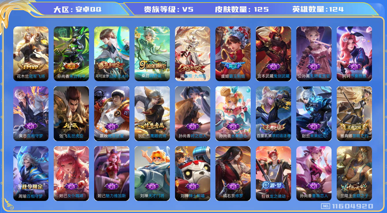 [11604920]V5 4传说 124英雄 125皮肤 可修改实名 优质装备:冠军飞将,末日机甲-孙尚香(绿蚂蚱) 珍宝阁皮:蔷薇恋人 限定皮:愿照·九州拓(澜年限),鸣野蒿,霸王别姬-虞姬,山海·玄木吟(马可年限) 史诗皮:龙之律动,百相守梦-周瑜,百相守梦-黄忠,无限星赏官,时之恋人-孙尚香,乱世虎臣,节奏热浪,修罗,女仆咖啡,摇滚巨星,水果甜心,绅士熊喵,天才门将,鬼剑武藏,原初追逐者,鹰眼统帅,魅力维加斯,黎明之约,未来纪元-赵云