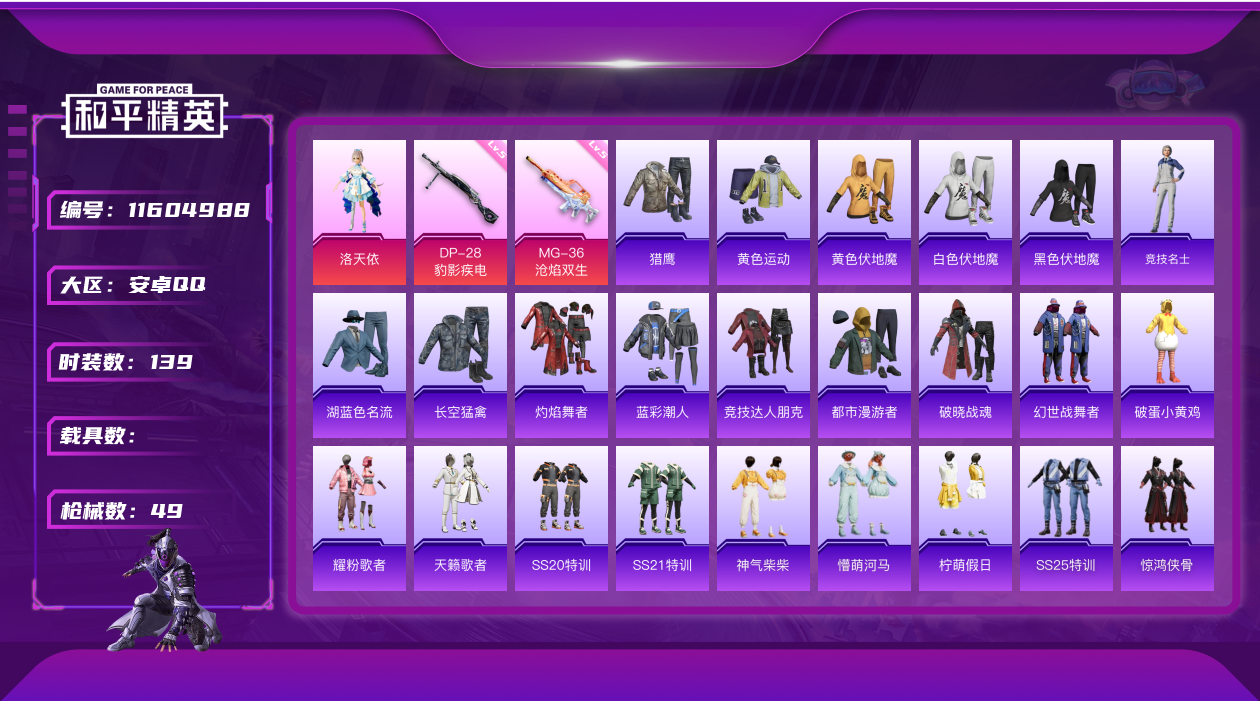 [11604988]1粉装 2特效枪 1印记 可二次 可修改实名 优质装备:洛天依 稀有枪皮:MG-36-沧焰双生,DP-28-豹影疾电 五级特效枪:五级DP-28-豹影疾电,五级MG-36-沧焰双生 紫色装扮:SS21特训,云朵鹅,雪绒豹,SS33特训套装,SS20特训,天籁歌者,都市漫游者,长空猛禽,蓝彩潮人,黄色伏地魔,黄色运动,黑色伏地魔,柠萌假日,幻世战舞者,湖蓝色名流,白色伏地魔,破晓战魂,破蛋小黄鸡,竞技达人朋克,灼焰舞者,猎鹰,竞技名士,惊鸿侠骨,神气柴柴,懵萌河马,SS24特训(SS24特训套装),SS25特训,元气发射,锦衣飞扬,耀粉歌者 优质战备:绯穹魔姬降落伞,拂晓神骑降落伞