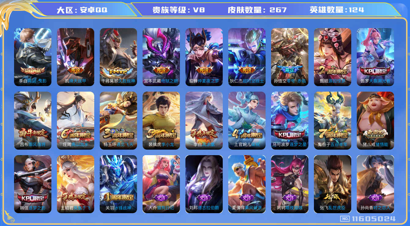 [11605024]V8 1典藏 8传说 124英雄 267皮肤 可修改实名 荣耀水晶:鸣剑·曳影 传说皮:零号·赤焰,仲夏夜之梦(大飞蛾),地狱之眼,久胜战神,绛天战甲(鸡嘴战神),超时空战士-狄仁杰 珍宝阁皮:妄想食味,蔷薇恋人 限定皮:凤求凰(白切鸡),凤凰于飞,遇见飞天,高山流水,五谷丰年,冰锋战神,游园惊梦,梁祝,御风骁将(吕布年限),逐梦之星,天狼溯光者,李小龙,逐梦之影,猪悟能 史诗皮:苍穹之光,黄金分割率,千年之狐,冰冠公主,偶像歌手,暗夜猫娘,龙骑士(小龙虾),猫狗日记-孙策,猫狗日记-大乔,时之恋人-孙尚香,乱世虎臣,修罗,女仆咖啡,摇滚巨星,水果甜心,天才门将,星夜王子,心灵骇客,德古拉伯爵,鬼剑武藏,纤云弄巧,拒霜思,乘风破浪,逐浪之夏,水晶猎龙者,金属风暴,圣诞狂欢,圣诞恋歌,鹰眼统帅,暗夜贵公子,魅力维加斯,未来纪元-赵云