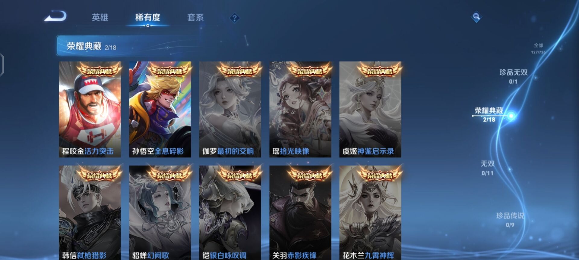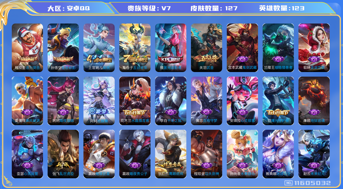 [11605032]V7 2典藏 1传说 123英雄 127皮肤 可修改实名 优质装备:活力突击,全息碎影(猴子典藏) 珍宝阁皮:玩趣恶龙 限定皮:五谷丰年,武圣,梁祝,匿光追影者 史诗皮:器灵·浮梦炉,百相守梦-百里守约,百相守梦-黄忠,化蝶舞,紫霞仙子,特工魅影,千年之狐,冰冠公主,偶像歌手,暗夜猫娘,龙骑士(小龙虾),乱世虎臣,摇滚巨星,水果甜心,绅士熊喵,心灵骇客,功夫厨神,暗隐猎兽者,鬼剑武藏,心灵战警,地狱岩魂,乘风破浪,水晶猎龙者,曙光守护者,金属风暴,圣诞狂欢,圣诞恋歌,鹰眼统帅,暗夜贵公子,魅力维加斯,无心,未来纪元-赵云