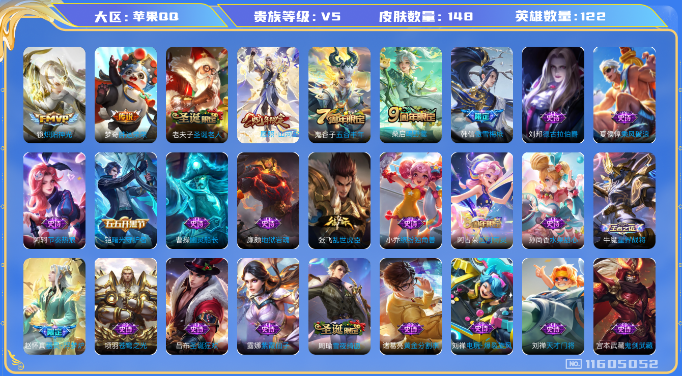 [11605052]V5 4传说 122英雄 148皮肤 可修改实名 优质装备:炽阳神光,胖达荣荣 珍宝阁皮:万物之道,玩趣恶龙 限定皮:愿照·山河定(司空震年限),鸣野蒿,傲雪梅枪,五谷丰年,圣诞老人 史诗皮:器灵·浮梦炉,星界战将,蒙犽顽岩魄,紫霞仙子,苍穹之光,黄金分割率,特工魅影,电玩·爆裂旋风,江河有灵,雪夜绮愿(周瑜),百解令(蒙犽),蒙恬荣光圣徽,乱世虎臣,节奏热浪,修罗,摇滚巨星,水果甜心,天才门将,星夜王子,德古拉伯爵,暗隐猎兽者,幽灵船长,鬼剑武藏,地狱岩魂,纤云弄巧,拒霜思,缤纷独角兽,乘风破浪,水晶猎龙者,曙光守护者,金属风暴,原初追逐者,圣诞狂欢,圣诞恋歌,鹰眼统帅,魅力维加斯,黎明之约,未来纪元-赵云