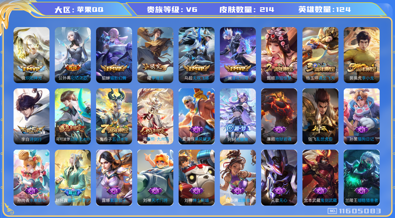 [11605083]V6 8传说 124英雄 214皮肤 可修改实名 优质装备:猫影幻舞,炽阳神光,李逍遥,无双飞将,记忆之芯(机甲兔),澜逐花归海 珍宝阁皮:胡桃夹子,优雅恋人 限定皮:愿照·九州拓(澜年限),遇见飞天,诗剑行,五谷丰年,游园惊梦,李小龙,山海·玄木吟(马可年限) 史诗皮:器灵·浮梦炉,化蝶舞,龙之律动,战舞者,紫霞仙子,特工魅影,蒙恬荣光圣徽,晚萤,猫狗日记-孙策,乱世虎臣,修罗,摇滚巨星,水果甜心,绅士熊喵,天才门将,星夜王子,暗隐猎兽者,鬼剑武藏,地狱岩魂,纤云弄巧,繁星吟游(呼啦呼啦),乘风破浪,水晶猎龙者,金属风暴,原初追逐者,圣诞恋歌,鹰眼统帅,魅力维加斯,黎明之约,赏金猎手,滕王阁序,无心