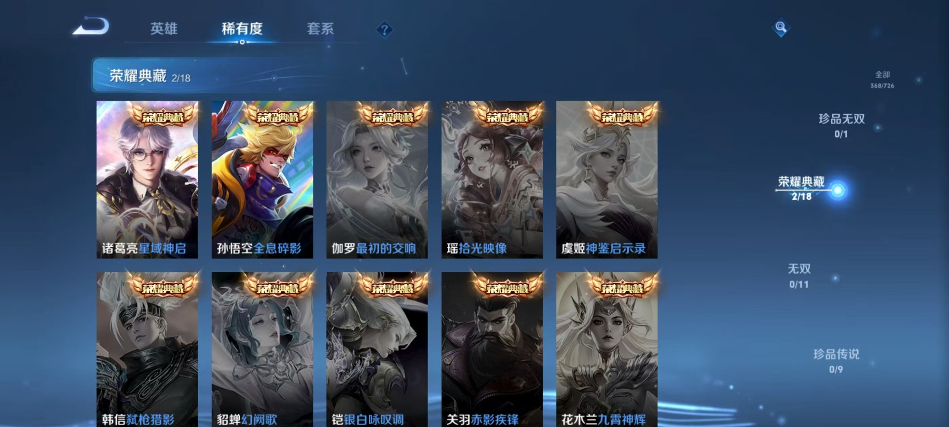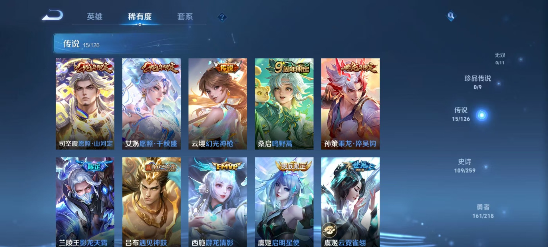 - [13866210]安卓Q-V8-最强王者段位-125英雄-301皮肤-1典藏-0珍品无双-0无双-0珍品传说-11传说-85史诗 【荣耀典藏】:诸葛亮星域神启 【传说皮肤】:女娲愿照千秋盛,桑启鸣野蒿,孙悟空齐天大圣,不知火舞绯月行,马超无双飞将,虞姬启明星使,伽罗太华,李白凤求凰,孙尚香末日机甲,宫本武藏地狱之眼,孙悟空地狱火 【限定皮肤】:白起狰,大乔绒语心约,姜子牙天穹之誓,狄仁杰阴阳师,虞姬凯尔特女王,赵云皇家上将,墨子神迹守卫,孙尚香蔷薇恋人,鲁班七号狮舞东方,高渐离死亡摇滚,阿轲迷踪丽影,扁鹊奇幻香踪,芈月重明,周瑜赤莲之焰,夏侯惇朔风刀,曹操烛龙,典韦穷奇,典韦岱宗,马可波罗暗影游猎,马可波罗山海玄木吟,狄仁杰魔术师,狄仁杰万华元夜,达摩星际陆战队,项羽海滩派对,老夫子醍醐杖,老夫子航海奇遇记,关羽冰锋战神,程咬金演武夺筹,刘邦夺宝奇兵,韩信飞衡,王昭君凤凰于飞,兰陵王驯魔猎人,花木兰瑞麟志,不知火舞绯月行,亚瑟潮玩骑士王,孙悟空美猴王,孙悟空至尊宝,孙悟空齐天大圣,牛魔御旌,后羿辉光之辰,李元芳银河之约,李元芳云中旅人,虞姬启明星使,钟馗神迹守卫,钟馗驱傩正仪,杨戬潮玩骑兵,干将莫邪冰霜恋舞曲,雅典娜黎明之约,蔡文姬繁星吟游,太乙真人华丽摇滚,鬼谷子原初探秘者,鬼谷子五谷丰年,百里玄策原初追逐者,弈星混沌棋,梦奇顽趣,沈梦溪星空之诺,明世隐疑决卦,裴擒虎李小龙,裴擒虎擒涛扼浪,狂铁御狮,米莱狄御霄,米莱狄胡桃异想国,云中君纤云弄巧,伽罗太华,盾山御銮,猪八戒西部大镖客,上官婉儿梁祝,嫦娥暖冬兔眠,西施玲珑珍味,鲁班大师探海日志,桑启海盐诗旅,暃星界游侠,戈娅驭风魔法,张良古海寻踪,蒙犽百解令,蒙恬荣光圣徽,鬼谷子天穹祈灯,刘邦剑破天穹,程咬金群星魔术团,刘备异域游侠,周瑜熔金海岸 【年限皮肤】:花木兰瑞麟志,孙悟空美猴王,王昭君凤凰于飞,李白凤求凰,后羿辉光之辰,伽罗太华,韩信飞衡,典韦岱宗,马可波罗山海玄木吟 【赛季限定】:白起狰,芈月重明,夏侯惇朔风刀,曹操烛龙,典韦穷奇,狄仁杰万华元夜,老夫子醍醐杖,程咬金演武夺筹,张良古海寻踪,牛魔御旌,李元芳云中旅人,虞姬凯尔特女王,钟馗驱傩正仪,雅典娜黎明之约,鬼谷子原初探秘者,百里玄策原初追逐者,弈星混沌棋,梦奇顽趣,明世隐疑决卦,裴擒虎擒涛扼浪,狂铁御狮,米莱狄御霄,盾山御銮,鲁班大师探海日志,桑启海盐诗旅,鬼谷子天
