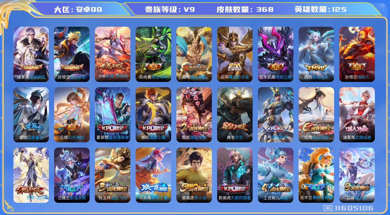 [11605106]V9 2典藏 15传说 125英雄 368皮肤 可修改实名 优质装备:全息碎影(猴子典藏),星域神启(倪克斯贼亮),黄金射手座,云霓雀翎,末日机甲-孙尚香(绿蚂蚱),地狱火,地狱之眼,游龙清影(小青龙),遇见神鼓 传说皮:乘龙·淬吴钩(孙策年限),幻光神枪 珍宝阁皮:妄想食味,优雅恋人 限定皮:愿照·山河定(司空震年限),愿照·千秋盛(女娲年限),逐霄战戟,陌上桑,鸣野蒿,武陵仙君(小桃花),影龙天霄,遇见飞天,高山流水,匿光决锋者,五谷丰年,游园惊梦,梁祝,天狼狩猎者,逐梦之翼,岱宗(典韦年限),李小龙,孙行者,猪悟能,大圣娶亲,青春决赛季,蜜橘之夏 史诗皮:绮世丹青,化蝶舞,星界战将,灵蛊蚀心,龙之律动,茶境仙,破空之剑,怒海争锋,蔬乡物语(鲁班七号),百相守梦-百里守约,紫霞仙子,苍穹之光,电玩小子(小书包),白龙吟,黄金分割率,特工魅影,千年之狐,匿光侦查者,江河有灵,雪夜绮愿(周瑜),百解令(蒙犽),高渐离燃音魔法,偶像歌手,白蛇,暗夜猫娘,无限星赏官,晚萤,冰冠公主,末日机甲-吕布,猫狗日记-孙策,猫狗日记-大乔,时之恋人-孙尚香,乱世虎臣,节奏热浪,修罗,女仆咖啡,摇滚巨星,水果甜心,绅士熊喵,天才门将,星夜王子,心灵骇客,时之奇旅-安琪拉,功夫厨神,德古拉伯爵,暗隐猎兽者,幽灵船长,鬼剑武藏,暗渊魔法,心灵战警,乐园奇幻夜,天秀·启明,舞动绿茵,地狱岩魂,诗语江南,纤云弄巧,拒霜思,缤纷独角兽,乘风破浪,逐浪之夏,月团寄思,水晶猎龙者,曙光守护者,热力回旋,箭羽风息,金属风暴,圣诞狂欢,圣诞恋歌,鹰眼统帅,暗夜贵公子,魅力维加斯,无心,未来纪元-赵云