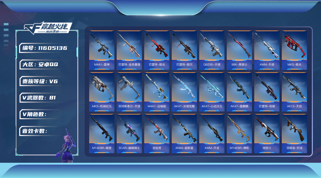 [11605136]可二次 可修改实名 V6 2王者武器 81英雄武器 165万化 枪王S 武器:王者之影,王者之魄,M4A1-雷神,巴雷特-金色蔷薇,巴雷特-极光,巴雷特-毁灭,QBZ95-天使,98K-黑骑士,AWM-天使,MK5-极光,MK5-机械纪元,双持斯泰尔-天使,M4A1-运输船,AK47-冰魂觉醒,AK47-心动次元,AK47-雷麒麟,巴雷特-枪娘,AK12-天启,M14EBR-暗夜,SCAR-幽暗骑士,剑齿虎,AN94-超新星,AWM-天龙,M14EBR-拂影,地狱火,汤姆逊-烈龙,加特林-堡垒,AK47-雅韵青花,气手枪-炼狱,沙鹰-修罗,沙鹰-宇航兔兔,沙鹰-神兵修罗,马来剑-毁灭,沙鹰-飞电,沙鹰-天神,斩魔刀,星芒,丛林匕首-庆龙觉醒,麒麟刺,秋逸,屠龙