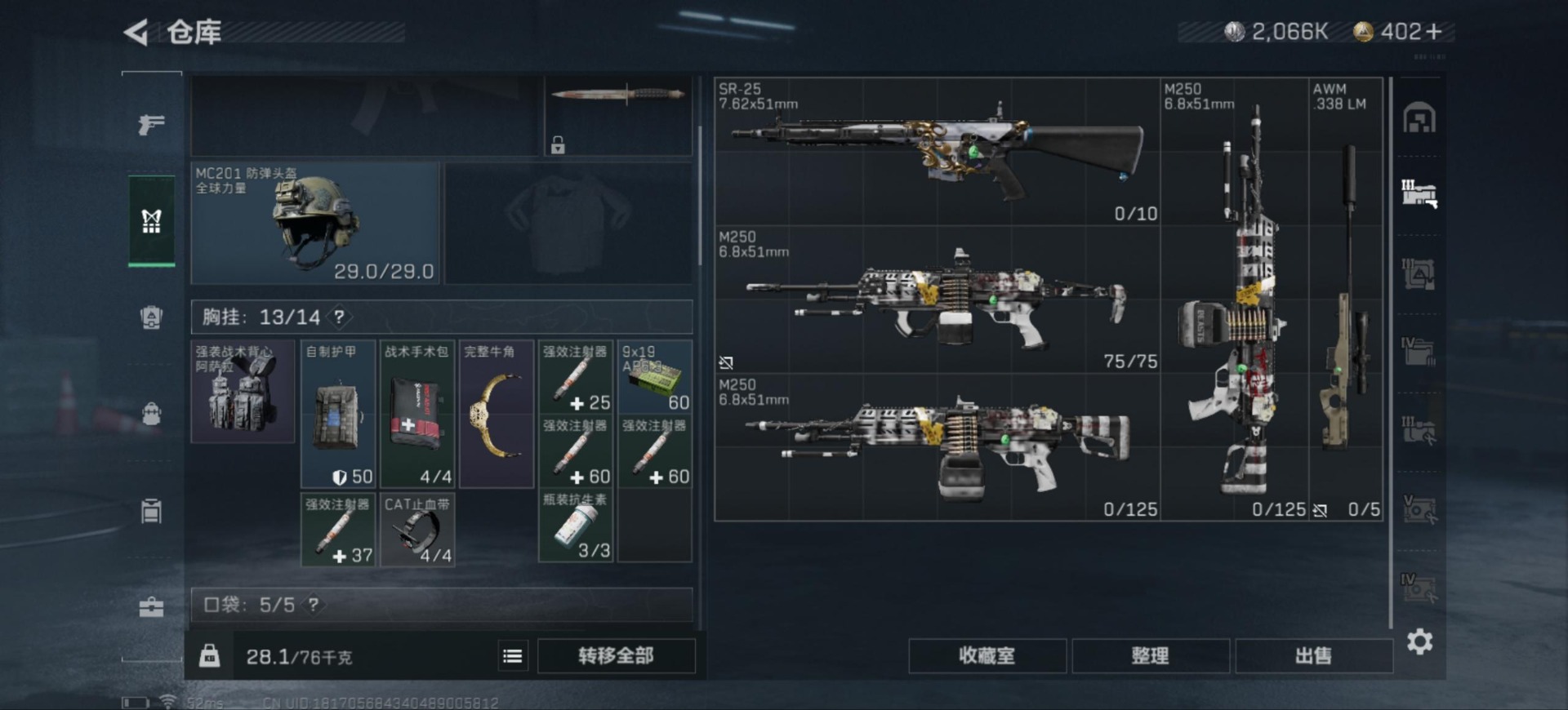 - [11284429]总资产:42.1 2传说枪械 可二次 可修改实名 烽火地带段位:青铜 全面战场段位:无段位 哈夫币:10.177 传说武器皮肤:M4A1突击步枪-阿米娅,勇士冲锋枪-能天使-午夜邮差 史诗武器皮肤:M700狙击步枪-蝮蛇,SV-98狙击步枪-林中猎手,M250通用机枪-囚徒,Vector冲锋枪-阿萨拉文明