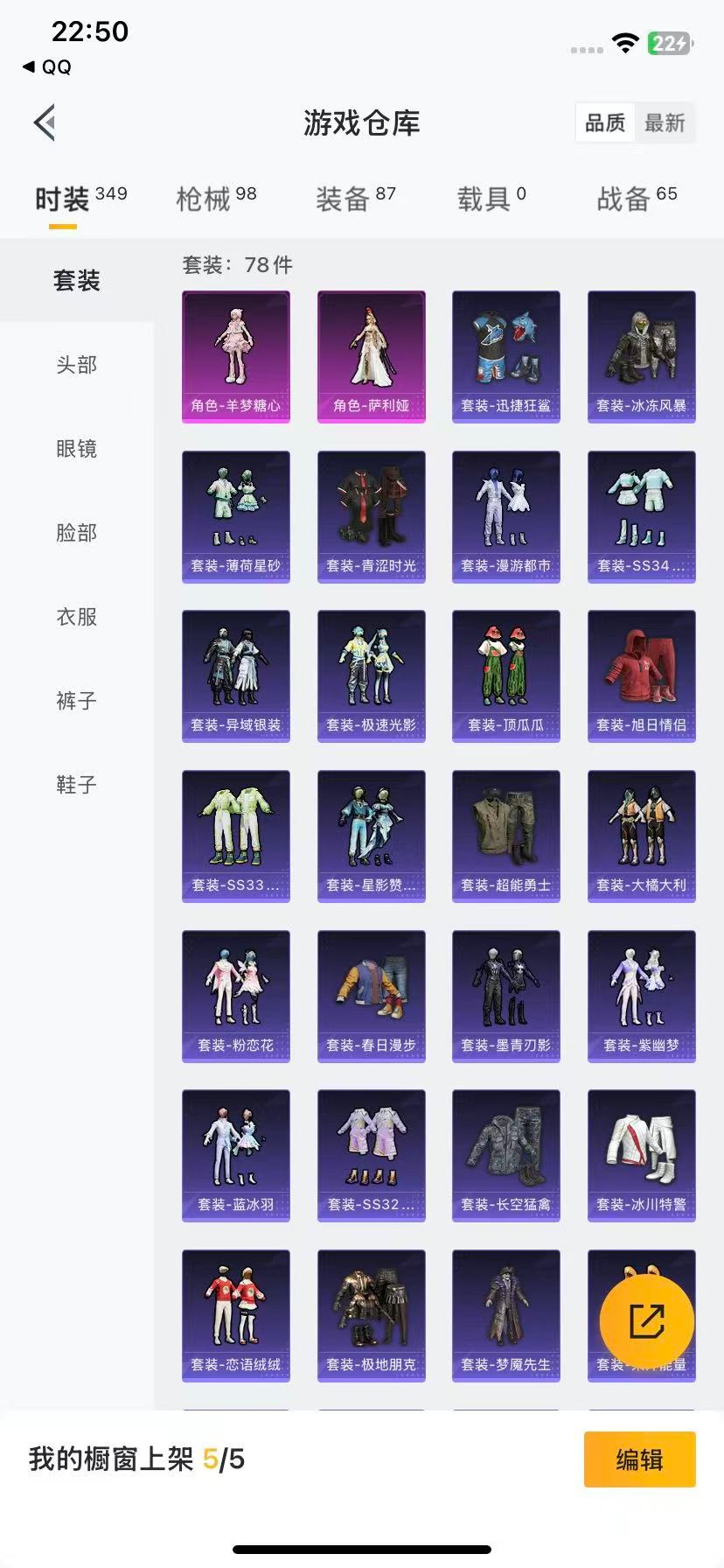 [11605262]2粉装 7特效枪 3印记 可二次 可修改实名 优质装备:GROZA-镜光银凌,萨利娅,AUG-暖羊咩咩,AMR-智耀战神,MK14-甜梦熊击,Vector-绯穹魔姬,羊梦糖心,Kar98K-巳巳如意 热门装扮:迅捷狂鲨,梦魇先生 稀有枪皮:DP-28-豹影疾电 六级特效枪:六级AMR-智耀战神 五级特效枪:五级GROZA-镜光银凌,五级Kar98K-巳巳如意,五级Vector-绯穹魔姬,五级DP-28-豹影疾电,五级MK14-甜梦熊击,五级AUG-暖羊咩咩 紫色装扮:SS31特训套装,冰川特警,冷焰舞者,旭日情侣,极速光影,SS30特训套装,SS33特训套装,青涩时光,顶瓜瓜,长空猛禽,青年教官,风暴特警,缤纷果语,蓝色运动,街头潮人,超能勇士,魅力单车,黄色伏地魔,黄色名流,黄色运动,黑色伏地魔,龟仙人,冰河战士,龙魂突击队,蝶变,香桃花海,极地朋克,极速红龙,橘黑制服,海岛探路者,清新柠檬,暗黑骑手,湖蓝色名流,绮丽涂鸦,白色伏地魔,破晓战魂,空岛之星,红色运动,燃烧卡路里,猛禽,猎鹰,SS29特训,星途旅人,SS28特训,光矢逐梦,异域银装,鱼渊荷华,燕燕于飞,巳巳如意,森林游猎者,竞技名士,街头风暴,果汁能量,SS27特训,智谋强哥,大橘大利,星影赞美诗,春日漫步,粉恋花,蓝冰羽,紫幽梦,SS32特训服(SS32特训套装),墨青刃影,绯格组合,恋语绒绒,冰冻风暴 优质战备:星途旅人降落伞,忍者神龟降落伞,鬼刀降落伞,月影灵韵降落伞
