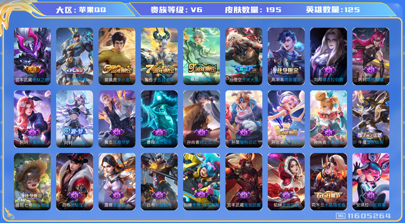 - [12252236]V9 3典藏 44传说 126英雄 327皮肤 典藏英雄武则天 可修改实名 优质装备:天鹅之梦(小乔典藏),星空梦想(太空人),弑枪猎影(韩信典藏),黄金狮子座,黄金射手座,冠军飞将,云鹰飞将(小将军),绛天战甲(鸡嘴战神),猫影幻舞,久胜战神,炽阳神光,一念神魔,云霓雀翎,末日机甲-孙尚香(绿蚂蚱),地狱火,仲夏夜之梦(大飞蛾),海洋之心,地狱之眼,淬星耀世,超时空战士-狄仁杰,碎云,山海·炽霜斩(李信年限),浮生妄,百相守梦(张飞),妄想奇谈,惊梅引,遇见神鼓,澜逐花归海,琥珀纪元铠,琥珀纪元马超,黄金天蝎座 传说皮:乘龙·淬吴钩(孙策年限),典韦战鼓燎原 珍宝阁皮:妄想食味,蔷薇恋人 限定皮:愿照·众生和(妲己年限),鸣野蒿,至尊宝,白虎志(电光耗子),凤求凰(白切鸡),梅西,武陵仙君(小桃花),异界灵契(白毛香),时之彼端,时雨天司(水龙头),神威(电光马子),影龙天霄,遇见飞天,高山流水,诗剑行,齐天大圣,五谷丰年,冰锋战神,游园惊梦,梁祝,逐梦之星,烈魂,奔雷神使(牛魔年限),天狼绘梦者,李小龙,逐梦之影,逐梦之光,永曜之星,辉光之辰,大圣娶亲,引擎之心,天魔缭乱,青春决赛季,云端筑梦师,蜜橘之夏,神奇女侠,深海之息(深海大菠萝) 史诗皮:狼魂孤将,琥珀纪元伽罗,紫霞仙子,苍穹之光,电玩小子(小书包),白龙吟,黄金分割率,特工魅影,千年之狐,江河有灵,魅语,高渐离燃音魔法,无限星赏官,冰冠公主,偶像歌手,晚萤,电玩·爆裂旋风,暗夜猫娘,龙骑士(小龙虾),末日机甲-吕布,猫狗日记-孙策,乱世虎臣,节奏热浪,修罗,女仆咖啡,摇滚巨星,水果甜心,天才门将,星夜王子,心灵骇客,功夫厨神,德古拉伯爵,暗隐猎兽者,幽灵船长,鬼剑武藏,暗渊魔法,心灵战警,地狱岩魂,诗语江南,纤云弄巧,缤纷独角兽,乘风破浪,逐浪之夏,水晶猎龙者,曙光守护者,箭羽风息,圣诞狂欢,圣诞恋歌,鹰眼统帅,王者之锤,魅力维加斯,赏金猎手,无心,未来纪元-赵云