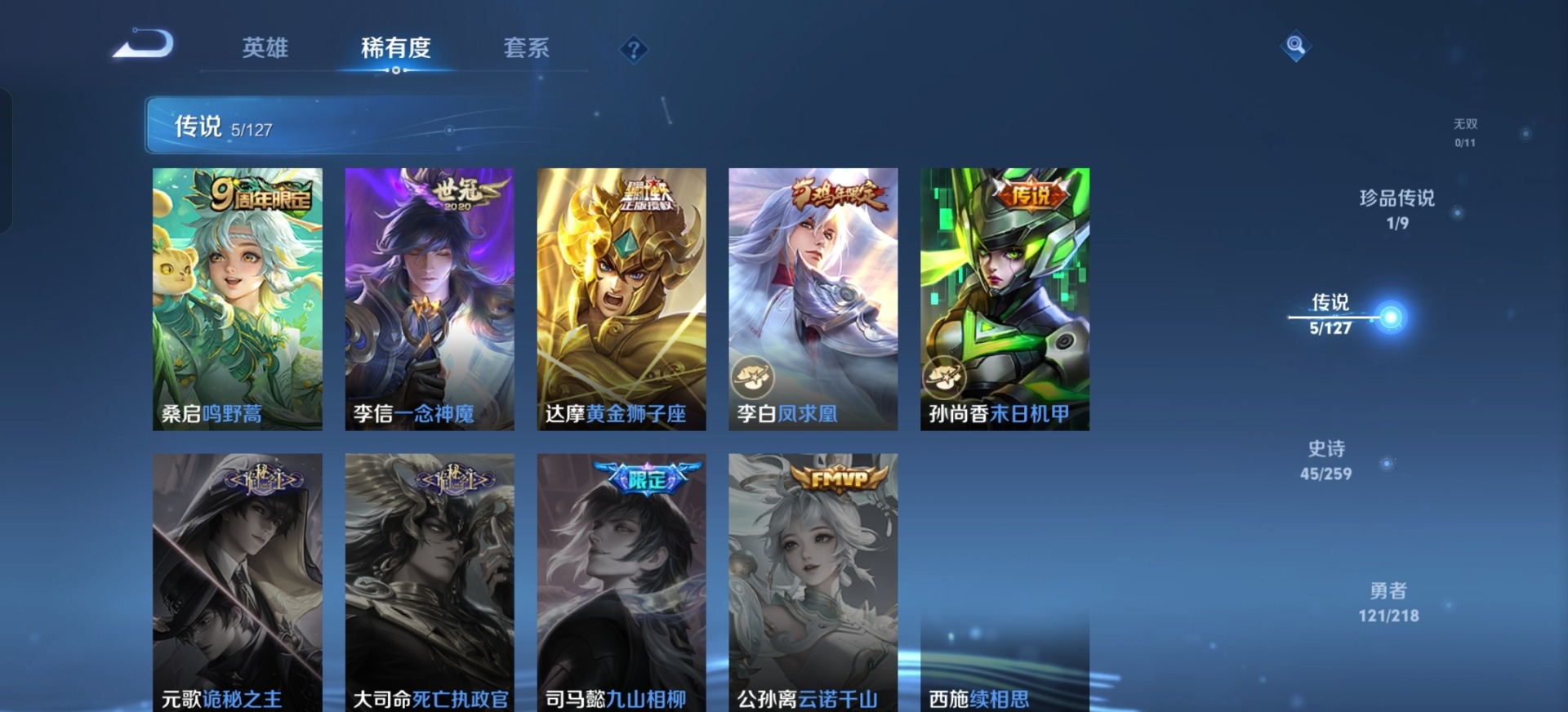 夏侯惇朔风刀,老夫子醍醐杖,沈梦溪大漠名商,盾山御銮,曹操烛龙,孙膑妖精王,苏烈千军破阵,典韦穷奇,达摩沙漠行僧,牛魔御旌,吕布猎兽之王,庄周蜃楼王,兰陵王金庭之子,裴擒虎擒涛扼浪,鲁班大师探海日志,明世隐疑决卦,白起狰,张良古海寻踪,桑启海盐诗旅,狄仁杰万华元夜,嬴政白昼王子,芈月重明,程咬金演武夺筹,扁鹊炼金王,李元芳云中旅人,弈星混沌棋,虞姬凯尔特女王,米莱狄御霄,钟馗驱傩正仪,狂铁御狮,太乙真人饕餮