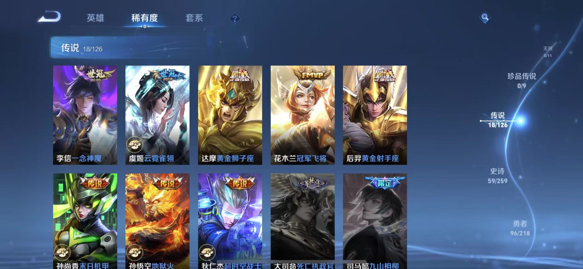 - PX_2060229-贵族等级: V5 英雄数: 85 皮肤数: 55 传说皮: 一念神魔,云霓雀翎,地狱火,仲夏夜之梦 限定皮: 五谷丰年,鸣野蒿