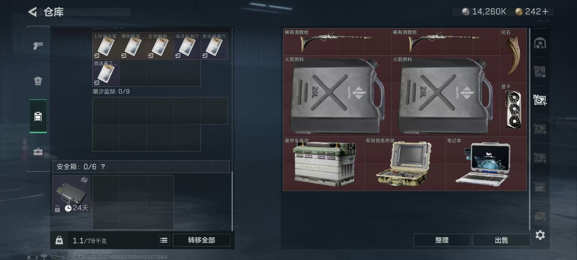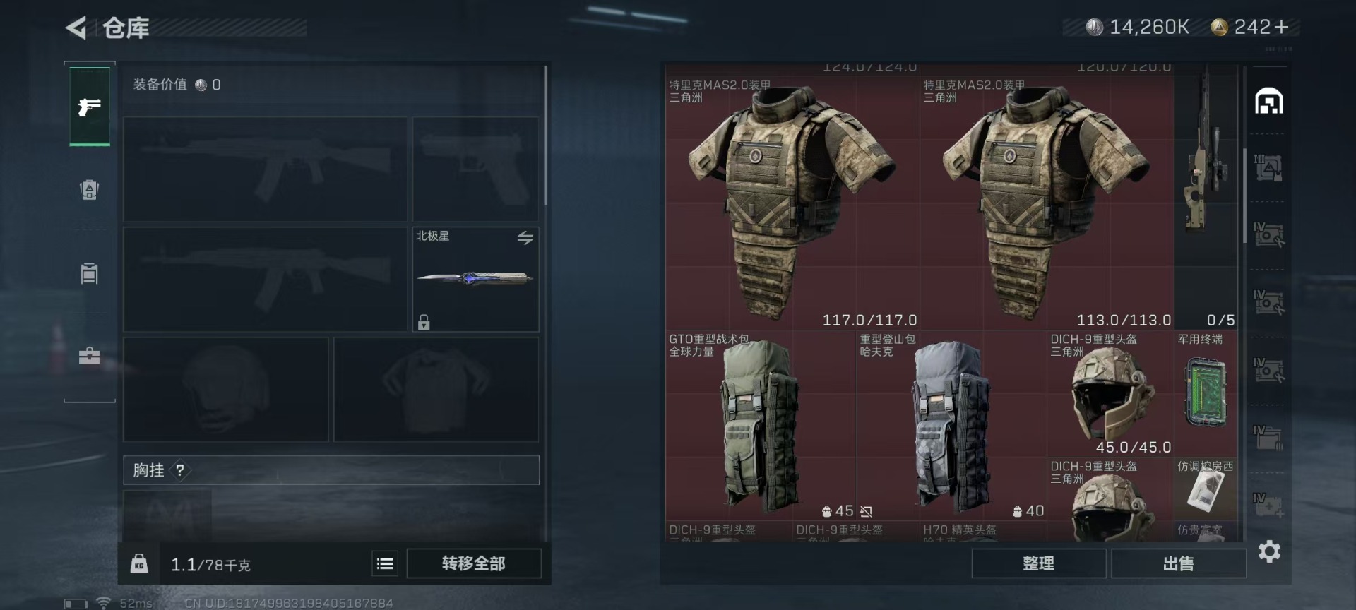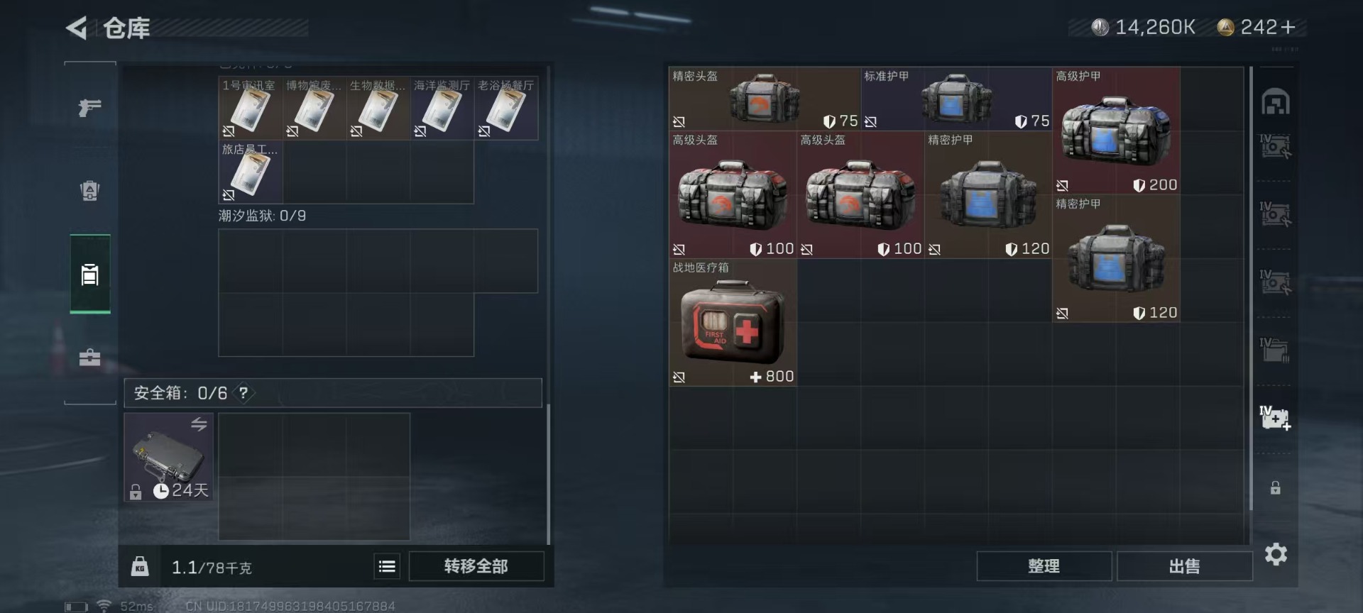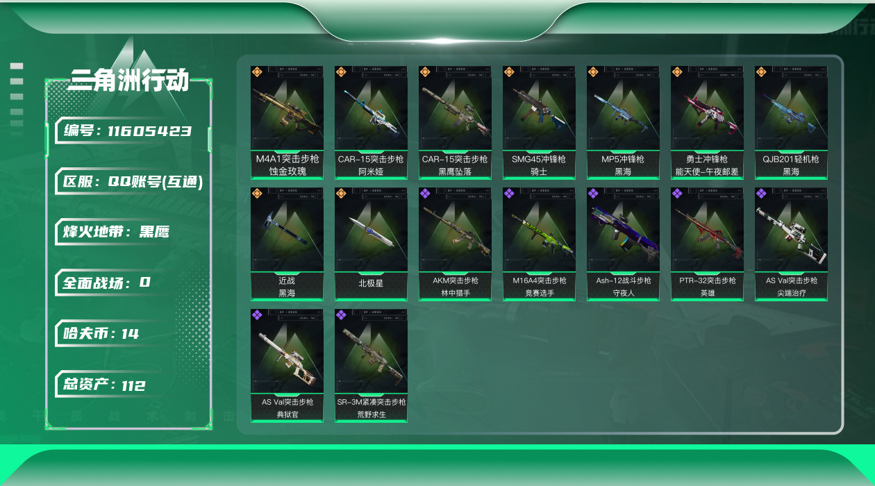 [11605423]总资产:112.2M 2近战传说 9传说枪械 哈夫币:14.260K 高级安全箱(2×3)9.15号到期 可二次 可修改实名 优质装备:近战-黑海,近战-北极星 烽火地带段位:黑鹰 全面战场段位:无段位 传说武器皮肤:SMG45冲锋枪-骑士,CAR-15突击步枪-阿米娅,勇士冲锋枪-能天使-午夜邮差,MP5冲锋枪-黑海,QJB201轻机枪-黑海,M4A1突击步枪-蚀金玫瑰,CAR-15突击步枪-黑鹰坠落 史诗武器皮肤:Ash-12战斗步枪-守夜人,M16A4突击步枪-竞赛选手,AS Val突击步枪-尖端治疗,AKM突击步枪-林中猎手,SR-3M紧凑突击步枪-荒野求生,PTR-32突击步枪-英雄,AS Val突击步枪-典狱官