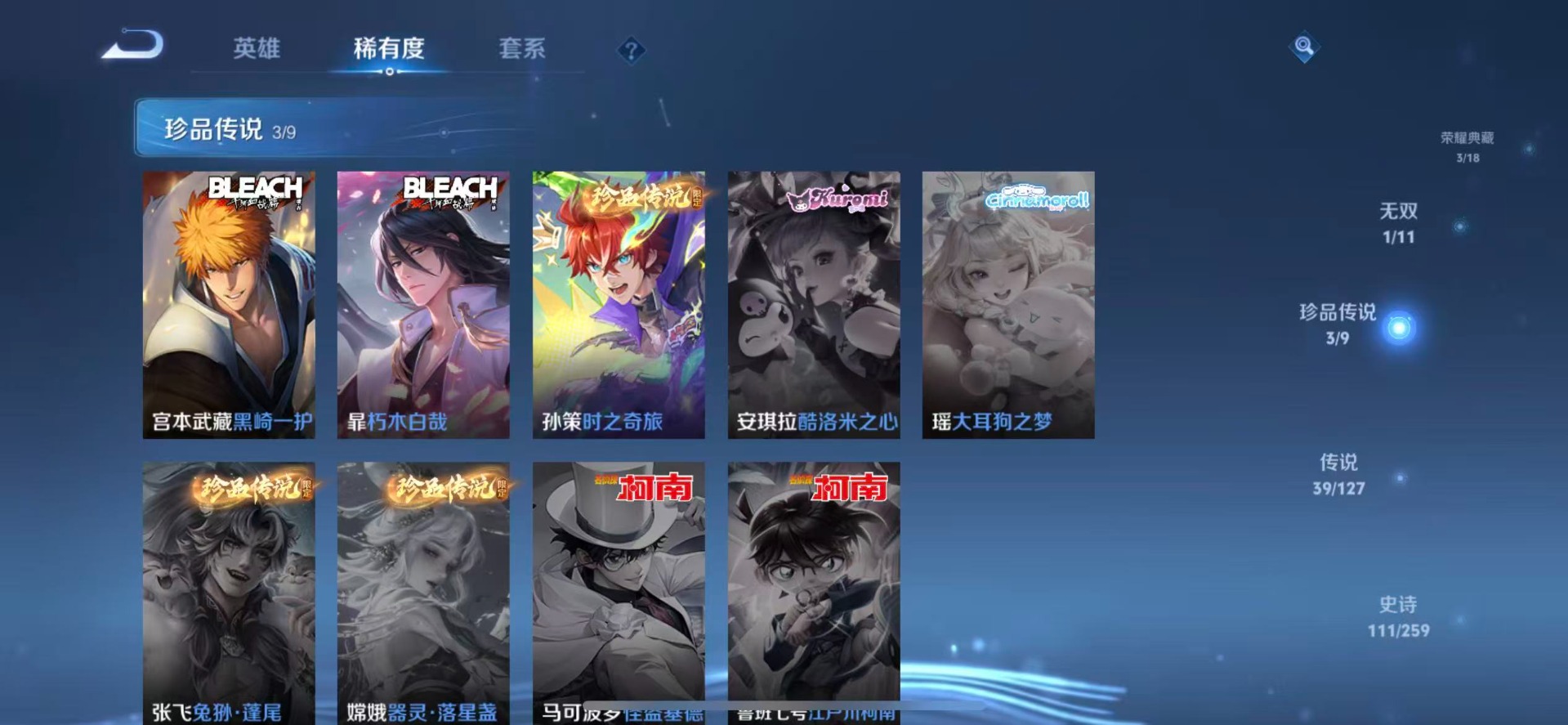 [11605439]V10 3典藏 1无双 3珍品传说 39传说 124英雄 393皮肤 可修改实名 优质装备:全息碎影(猴子典藏),九霄神辉(木兰典藏),幻阙歌(貂蝉典藏),碎月剑心(李白无双),朽木白哉,黑崎一护,黄金狮子座,云鹰飞将(小将军),绛天战甲(鸡嘴战神),久胜战神,炽阳神光,一念神魔,末日机甲-孙尚香(绿蚂蚱),地狱火,仲夏夜之梦(大飞蛾),地狱之眼,飞鸢探春,胖达荣荣,时之恋人-刘备(电焊工),淬星耀世,末日机甲-孙策,无双飞将,碎云,山海·炽霜斩(李信年限),山海·苍雷引(电光曜子),浮生妄,妄想实况,霜月吟,澜逐花归海,艾琳觅芳踪,黄金天蝎座 珍品传说:时之奇旅-孙策 传说皮:落雪白狼,云诺千山,祥瑞亨通,幻光神枪 珍宝阁皮:妄想食味,蔷薇恋人 限定皮:愿照·九州拓(澜年限),愿照·山河定(司空震年限),愿照·众生和(妲己年限),愿照·千秋盛(女娲年限),逐霄战戟,鸣野蒿,至尊宝,太华(伽罗年限),傲雪梅枪,时雨天司(水龙头),神威(电光马子),山海·碧波行(瑶年限),高山流水,诗剑行,匿光决锋者,怒海麟威,五谷丰年,青龙志(铠年限),冰锋战神,天狼运算者,梁祝,岱宗(典韦年限),辉光之辰,孙行者,猪悟能,冰霜恋舞曲,时之奇旅-妲己,神器·万象笔,山海·玄木吟(马可年限) 史诗皮:赞萌露比,鸭鸭历险记-刘禅,苍鳞隐世,器灵·浮梦炉,星界战将,龙之律动,小牛鸭,石田雨龙,百相守梦-周瑜,戍鼓铭心,茶境仙,海诺心动手记,破空之剑,怒海争锋,上官婉儿群星魔术团,蔬乡物语(鲁班七号),百相守梦-百里守约,百相守梦-黄忠,紫霞仙子,电玩小子(小书包),黄金分割率,特工魅影,千年之狐,电玩·爆裂旋风,江河有灵,百解令(蒙犽),高渐离燃音魔法,蒙恬荣光圣徽,偶像歌手,龙骑士(小龙虾),暗夜猫娘,魅语,无限星赏官,晚萤,冰冠公主,末日机甲-吕布,猫狗日记-孙策,猫狗日记-大乔,时之恋人-孙尚香,乱世虎臣,节奏热浪,修罗,女仆咖啡,摇滚巨星,水果甜心,绅士熊喵,星夜王子,心灵骇客,功夫厨神,德古拉伯爵,暗隐猎兽者,幽灵船长,鬼剑武藏,暗渊魔法,心灵战警,乐园奇幻夜,天秀·启明,舞动绿茵,地狱岩魂,纤云弄巧,拒霜思,缤纷独角兽,乘风破浪,逐浪之夏,水晶猎龙者,曙光守护者,热力回旋,箭羽风息,金属风暴,原初追逐者,圣诞狂欢,圣诞恋歌,鹰眼统帅,赏金猎手,无心,未来纪元-赵云