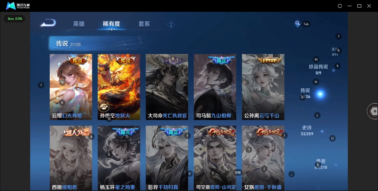 - [12118932]V8 21传说 125英雄 280皮肤 典藏英雄武则天 可修改实名 优质装备:黄金狮子座,黄金射手座,炽阳神光,一念神魔,云霓雀翎,末日机甲-孙尚香(绿蚂蚱),地狱火,仲夏夜之梦(大飞蛾),零号·赤焰,海洋之心,地狱之眼,胖达荣荣,淬星耀世,超时空战士-狄仁杰,无双飞将 传说皮:云诺千山 珍宝阁皮:优雅恋人,蔷薇恋人 限定皮:逐霄战戟,凤求凰(白切鸡),太华(伽罗年限),武陵仙君(小桃花),白晶晶,时雨天司(水龙头),神威(电光马子),遇见飞天,高山流水,五谷丰年,冰锋战神,天狼运算者,游园惊梦,梁祝,御风骁将(吕布年限),逐梦之星,天狼溯光者,天狼征服者,天狼绘梦者,李小龙,逐梦之影,孙行者,猪悟能,青春决赛季,乒乒小将,匿光追影者,女儿国国王 史诗皮:龙之律动,紫霞仙子,电玩小子(小书包),白龙吟,黄金分割率,特工魅影,千年之狐,江河有灵,魅语,无限星赏官,冰冠公主,偶像歌手,龙骑士(小龙虾),末日机甲-吕布,猫狗日记-孙策,猫狗日记-大乔,乱世虎臣,节奏热浪,修罗,女仆咖啡,摇滚巨星,水果甜心,绅士熊喵,天才门将,星夜王子,心灵骇客,时之奇旅-安琪拉,功夫厨神,德古拉伯爵,暗隐猎兽者,幽灵船长,鬼剑武藏,暗渊魔法,心灵战警,舞动绿茵,地狱岩魂,诗语江南,纤云弄巧,繁星吟游(呼啦呼啦),拒霜思,缤纷独角兽,乘风破浪,逐浪之夏,月团寄思,水晶猎龙者,曙光守护者,热力回旋,箭羽风息,金属风暴,圣诞狂欢,圣诞恋歌,鹰眼统帅,暗夜贵公子,魅力维加斯,无心,未来纪元-赵云