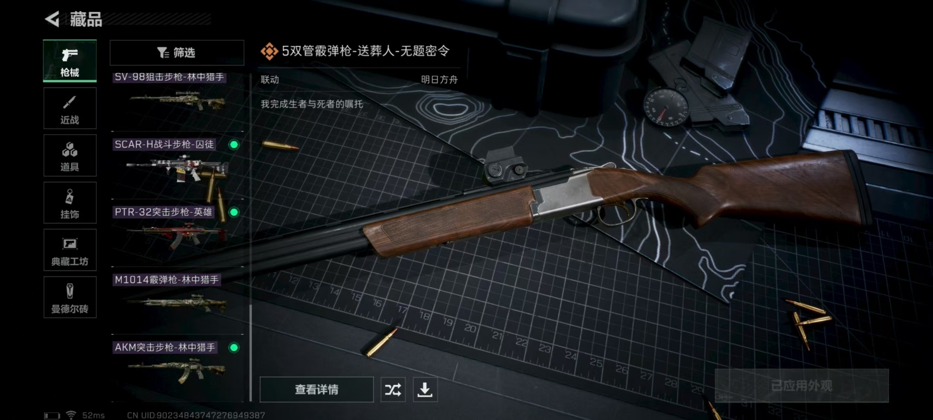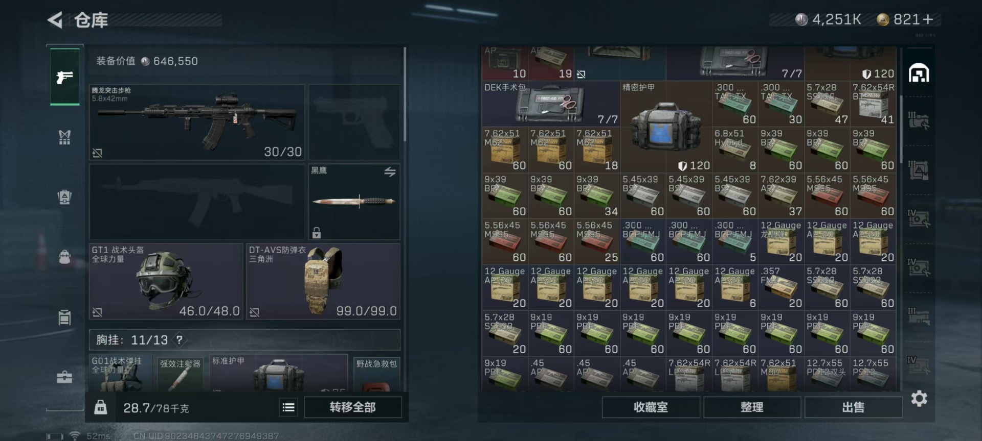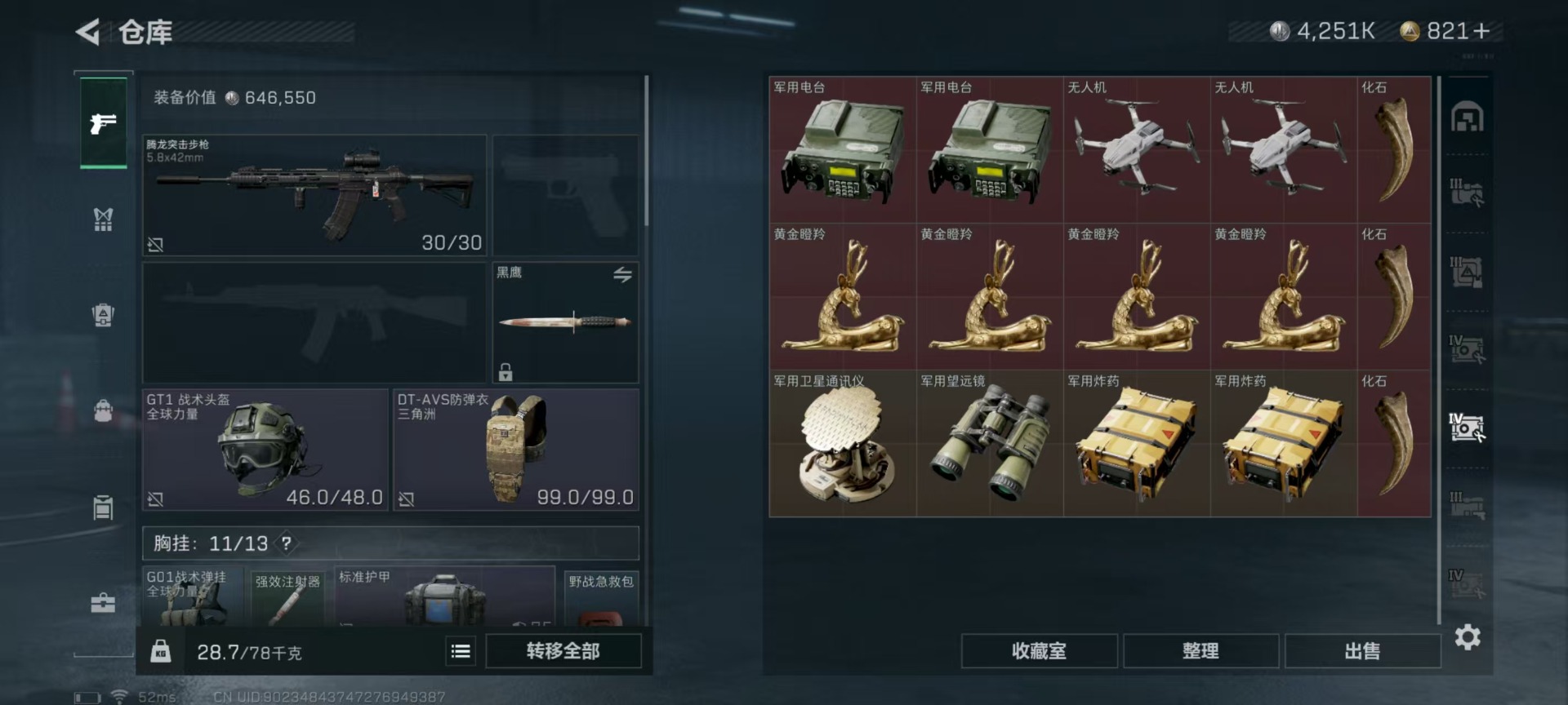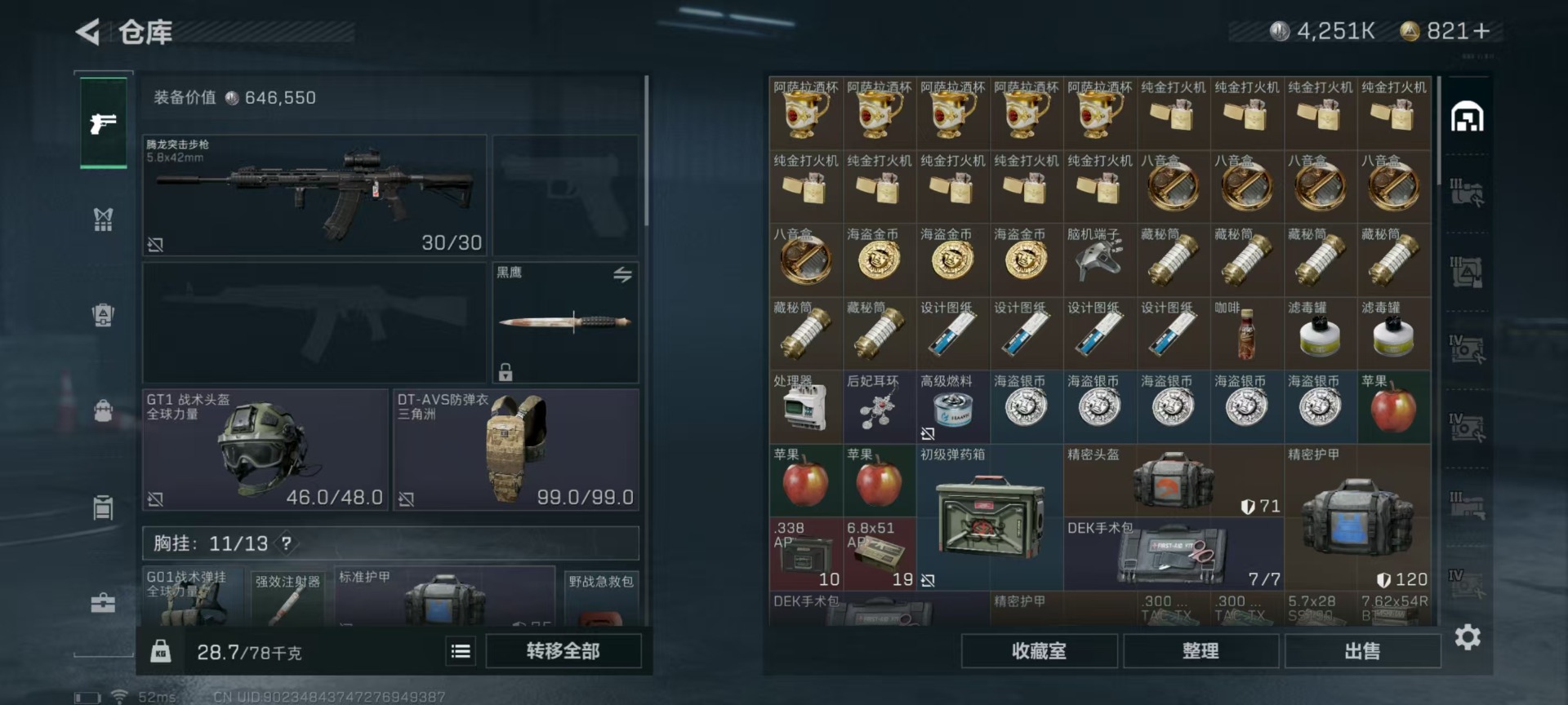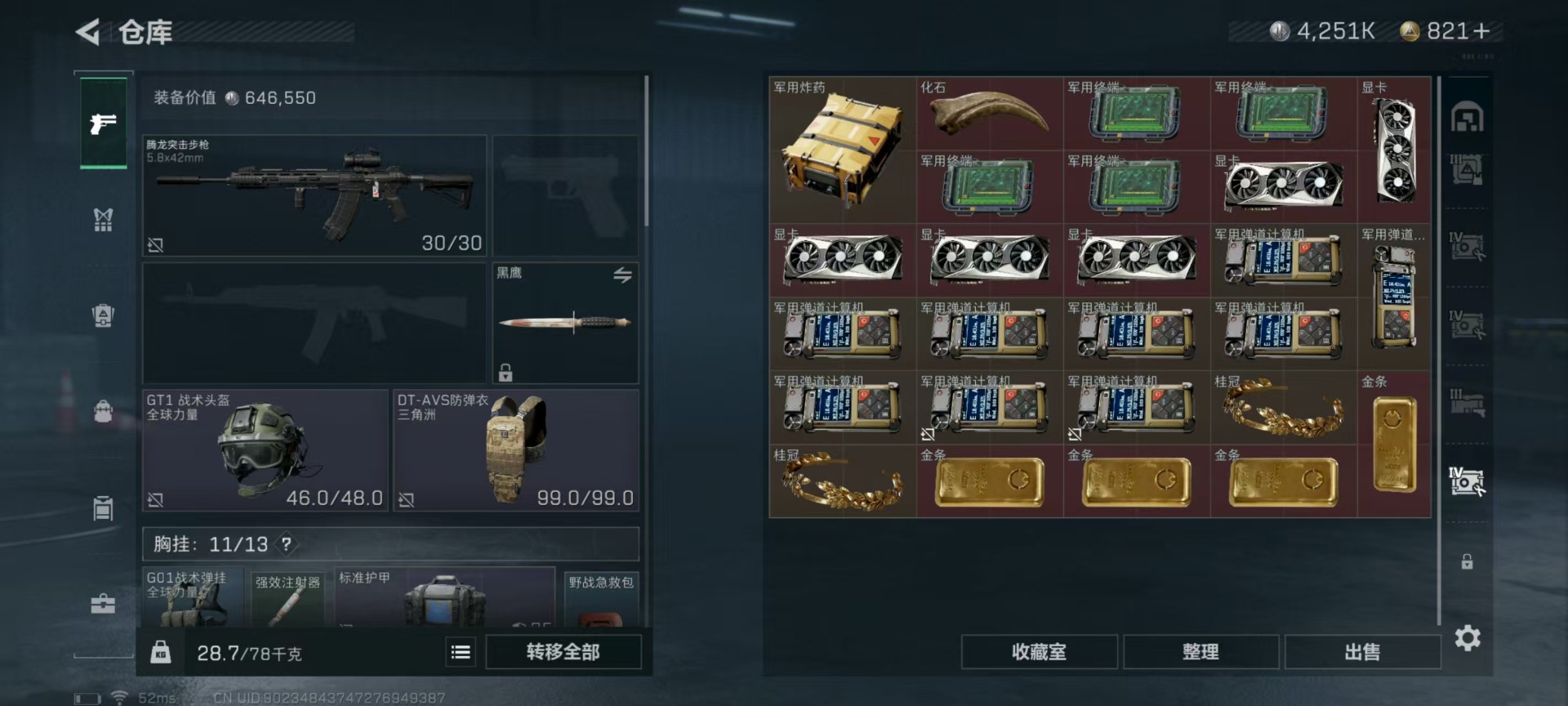 [11605470]总资产:147.7 2干员外观 3传说枪械 高级安全箱(9.17到期) 可二次 可修改实名 烽火地带段位:铂金 全面战场段位:无段位 哈夫币:4.251 传说武器皮肤:复合弓-黑-天际线,CAR-15突击步枪-阿米娅,725双管霰弹枪-送葬人-无题密令 史诗武器皮肤:PKM通用机枪-荒野求生,勇士冲锋枪-深海恐惧,AKM突击步枪-林中猎手,M16A4突击步枪-竞赛选手,SVD狙击步枪-荒野求生,M1014霰弹枪-林中猎手,PTR-32突击步枪-英雄,PSG-1射手步枪-无垢,M250通用机枪-囚徒,SV-98狙击步枪-囚徒,SCAR-H战斗步枪-囚徒,腾龙突击步枪-无垢,MP7冲锋枪-无垢 干员外观:蜂医-送葬人·无题密令(S5),露娜-黑·天际线