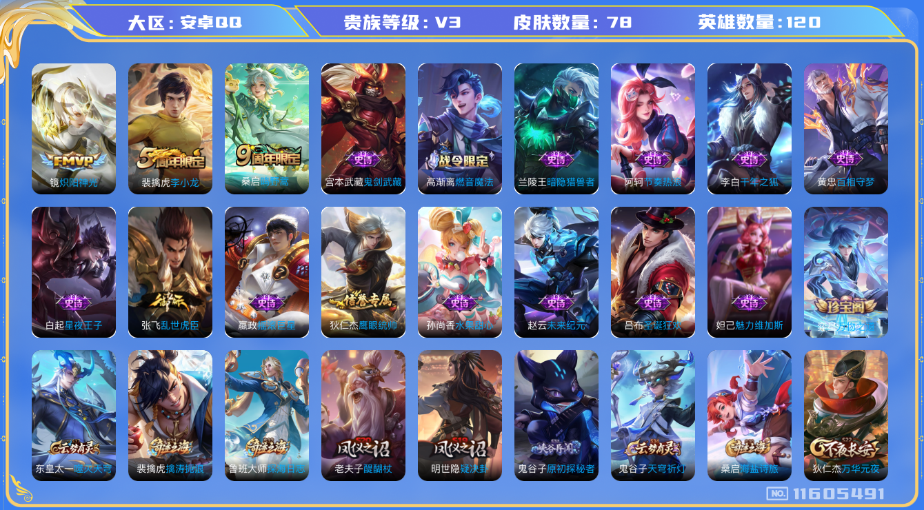 [11605491]V3 2传说 120英雄 78皮肤 可修改实名 优质装备:炽阳神光 珍宝阁皮:万物之道 限定皮:鸣野蒿,李小龙 史诗皮:百相守梦-黄忠,千年之狐,高渐离燃音魔法,乱世虎臣,节奏热浪,摇滚巨星,水果甜心,星夜王子,暗隐猎兽者,鬼剑武藏,圣诞狂欢,鹰眼统帅,魅力维加斯,未来纪元-赵云